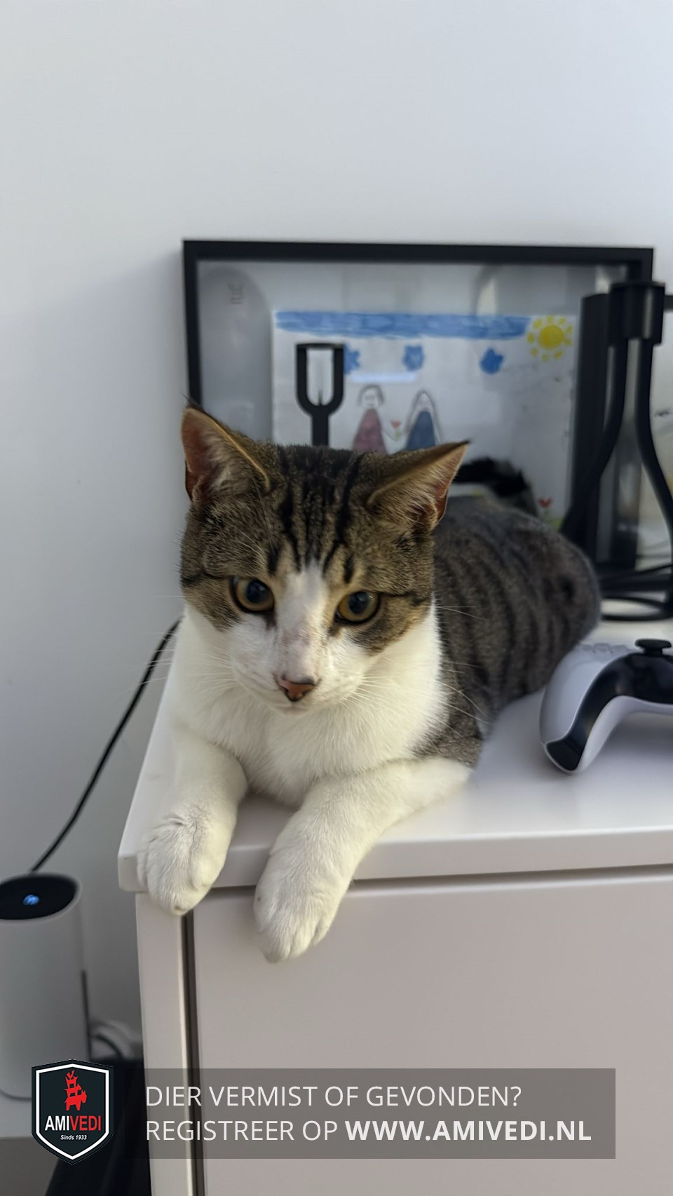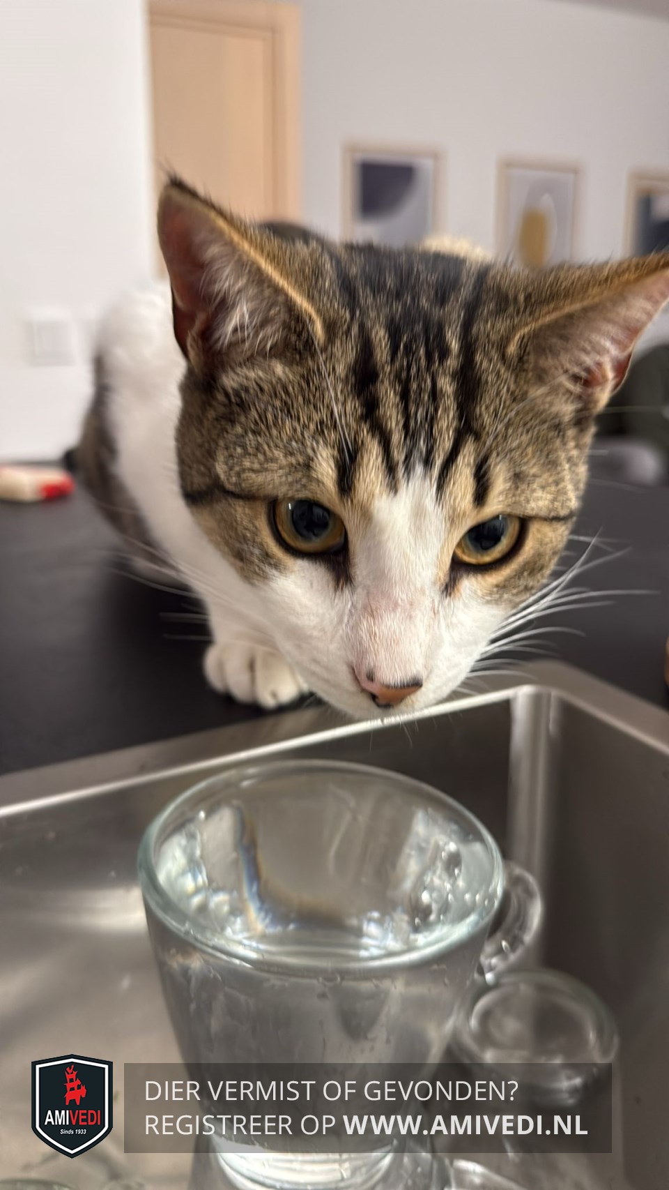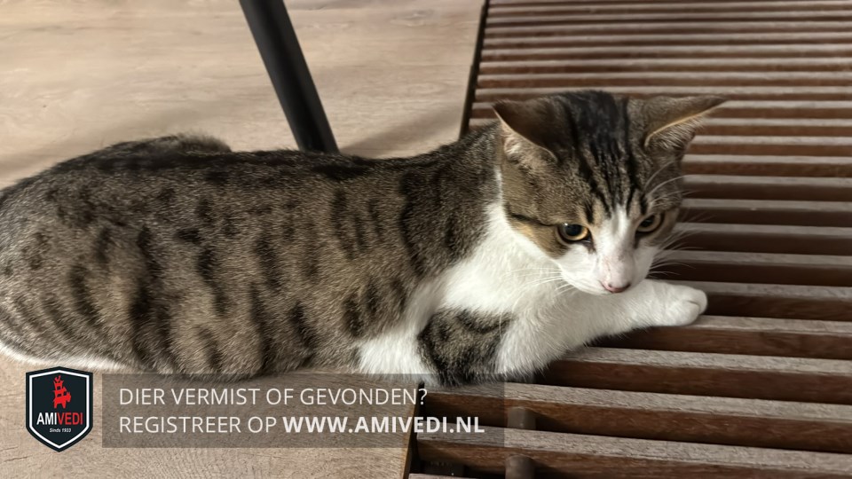| Signalement | Cypers bruin zwart gestreepte jonge kater met een gestreept masker en gestreepte bovenkant. Witte bles, snuit en witte voorpootjes, witte buik met een gestreept lijfje. Heeft ook wit aan de achterpootjes. |