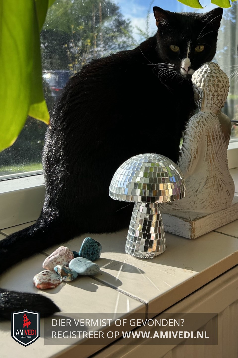 | Signalement | Zwart-witte kater. Wit snorretje, witte neus en dun wit lijntje tussen de ogen. Witte laarzen. Gele ogen en witte snorharen. Best schrikkerig. |