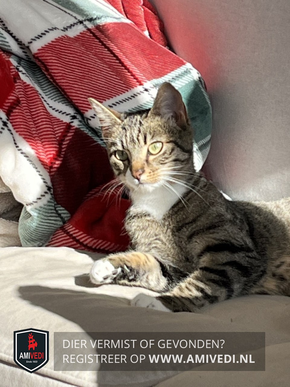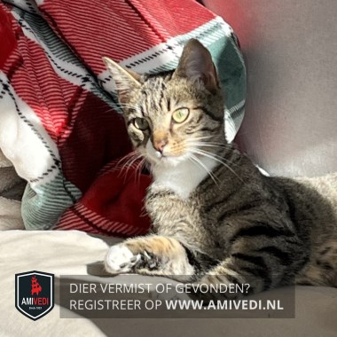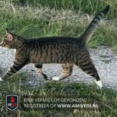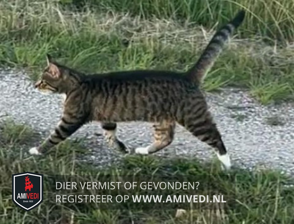 | Signalement | Cypers grijs/bruin gestreept met in ieder geval wit op haar rechterwang en kin. Witte borst en witte voeten aan haar voorpoten en witte sokjes aan haar achterpoten. |