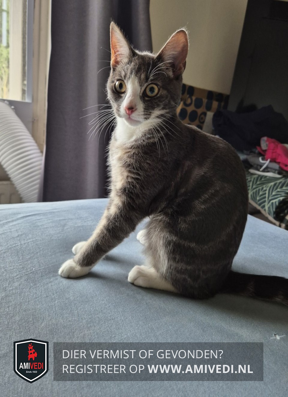 | Signalement | Kleine beige stipjes onder allebei z'n oogjes, als een traantje. Rose neusje met op de linker neusvleugel een bruin vlekje. Wit tussen de ogen rondom neus, mond wat doorloopt naar kin tot en met buik. Voorpootjes witte voetjes, achterpoten witte kousjes. |