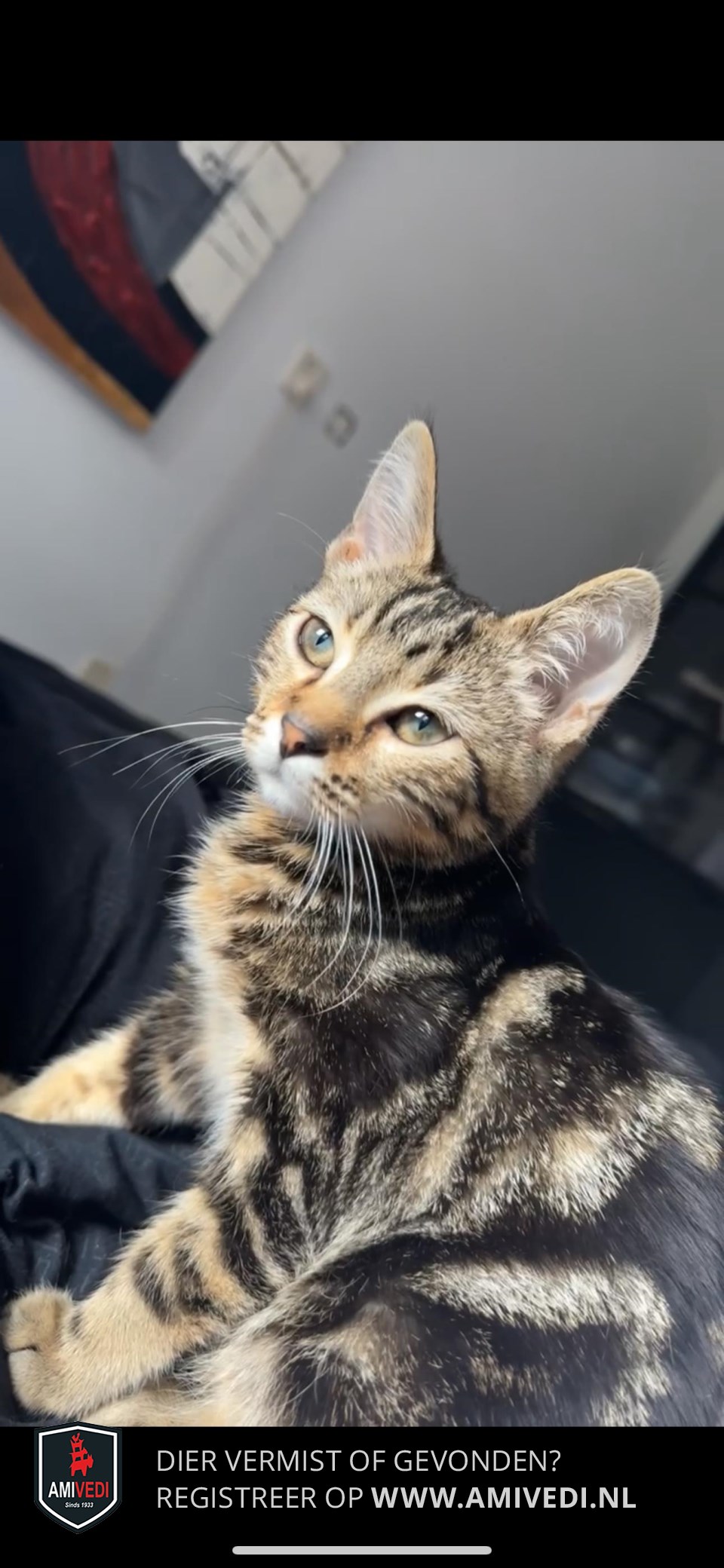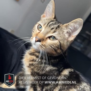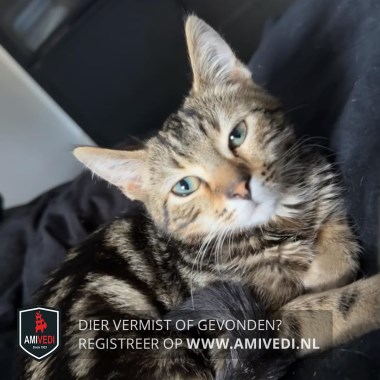 | Signalement | Cypers bruin gestreepte vacht met wit rond bekje. |
