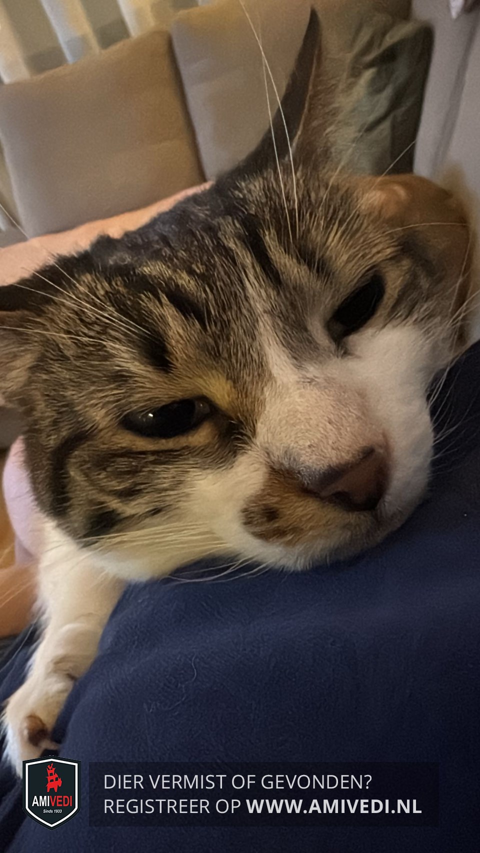 | Signalement | Bruin/zwart/wit. Cypers op de kop, rug, flank en staart. Witte snoetje met bruine vlek. Witte rechter voor en achterpoot. Linker voor en achterpoot zijn wit met cyperse vlek. |