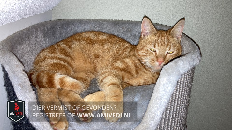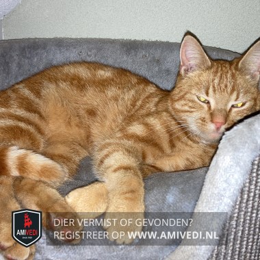 | Signalement | Rod/oranje gemarmerde kater. Iets wit op de wangen en aan het uiteinde van zijn staart. Roze neus. |