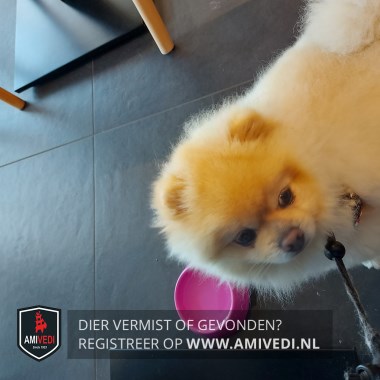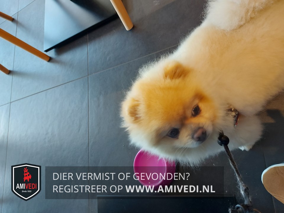 | Signalement | Beige met wit. Keeshondje, Pomeriaan. Witte kin en borst. Voorpoten zijn ook licht (wit). |