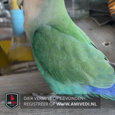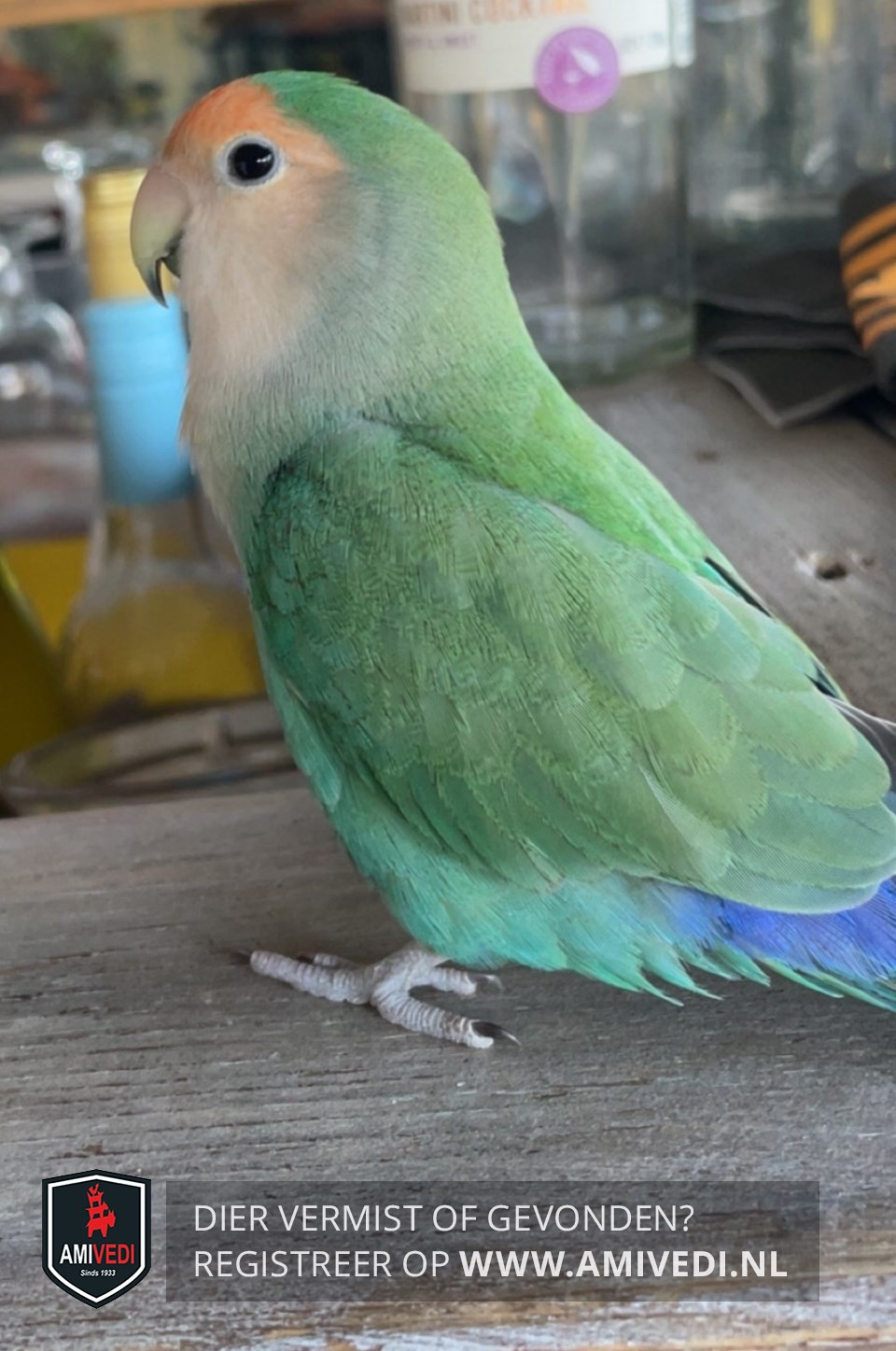 | Signalement | Groen met oranje en blauw. Voorhoofd oranje, kop en keel lichtoranje. Zwarte ogen. Achterhoofd groen. Rug groen, Vleugels groen. Buik groen. Ondervleugels blauw. Erg hand tam en mens gericht. |