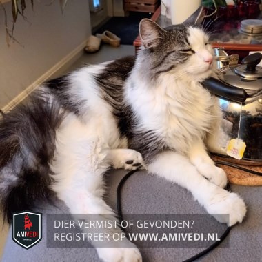 | Signalement | Heel veel wit. Cypers bruin/grijs/zwart op het kopje dat doorloopt over en langs de oogjes. Verder wit snuitje, brede witte sjaal om de nek, witte borst. Over de schouders cypers bruin/zwarte streep dat doorloopt naar de buik. Onderkant rug en staart bruin/grijs/zwart gemêleerd. Langharig. |