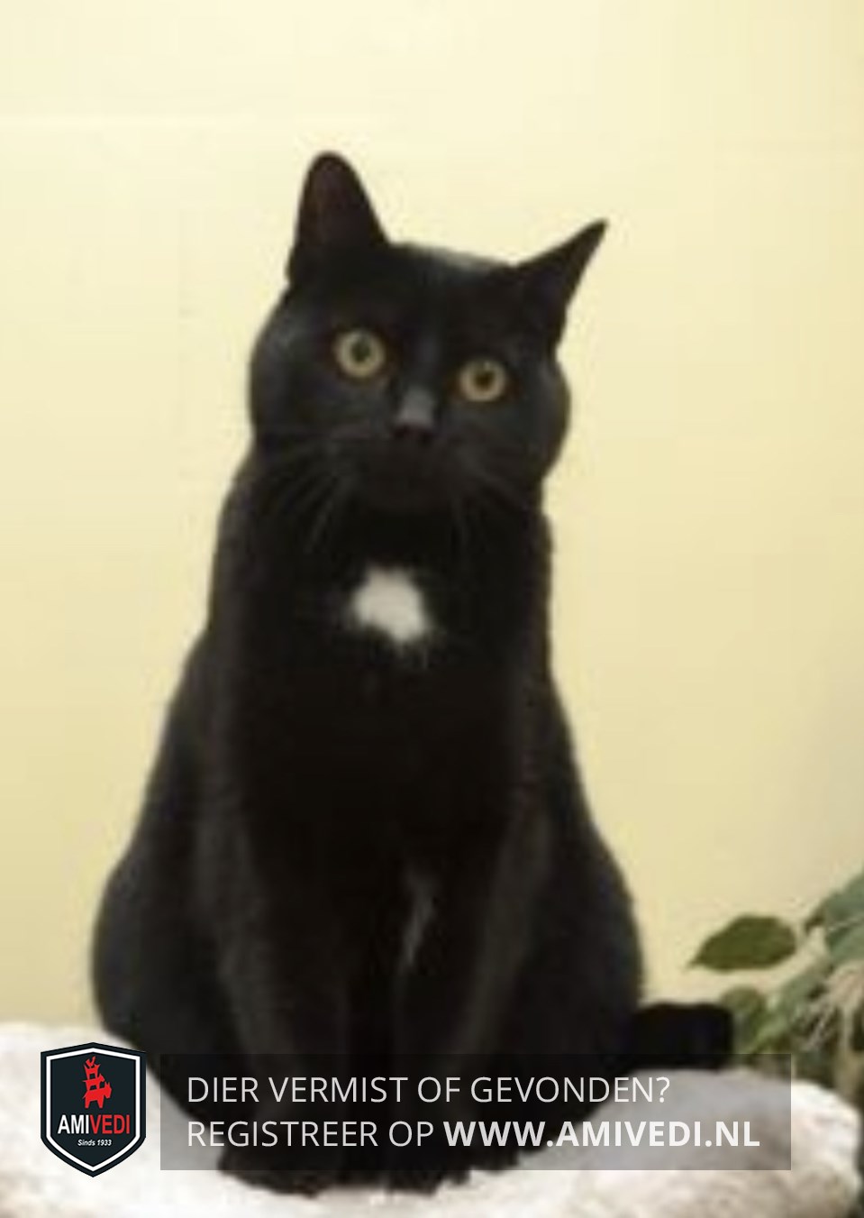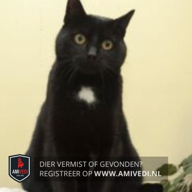 | Signalement | Zwart met een wit vlekje op zijn bef. |