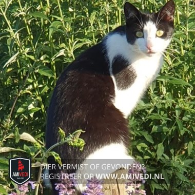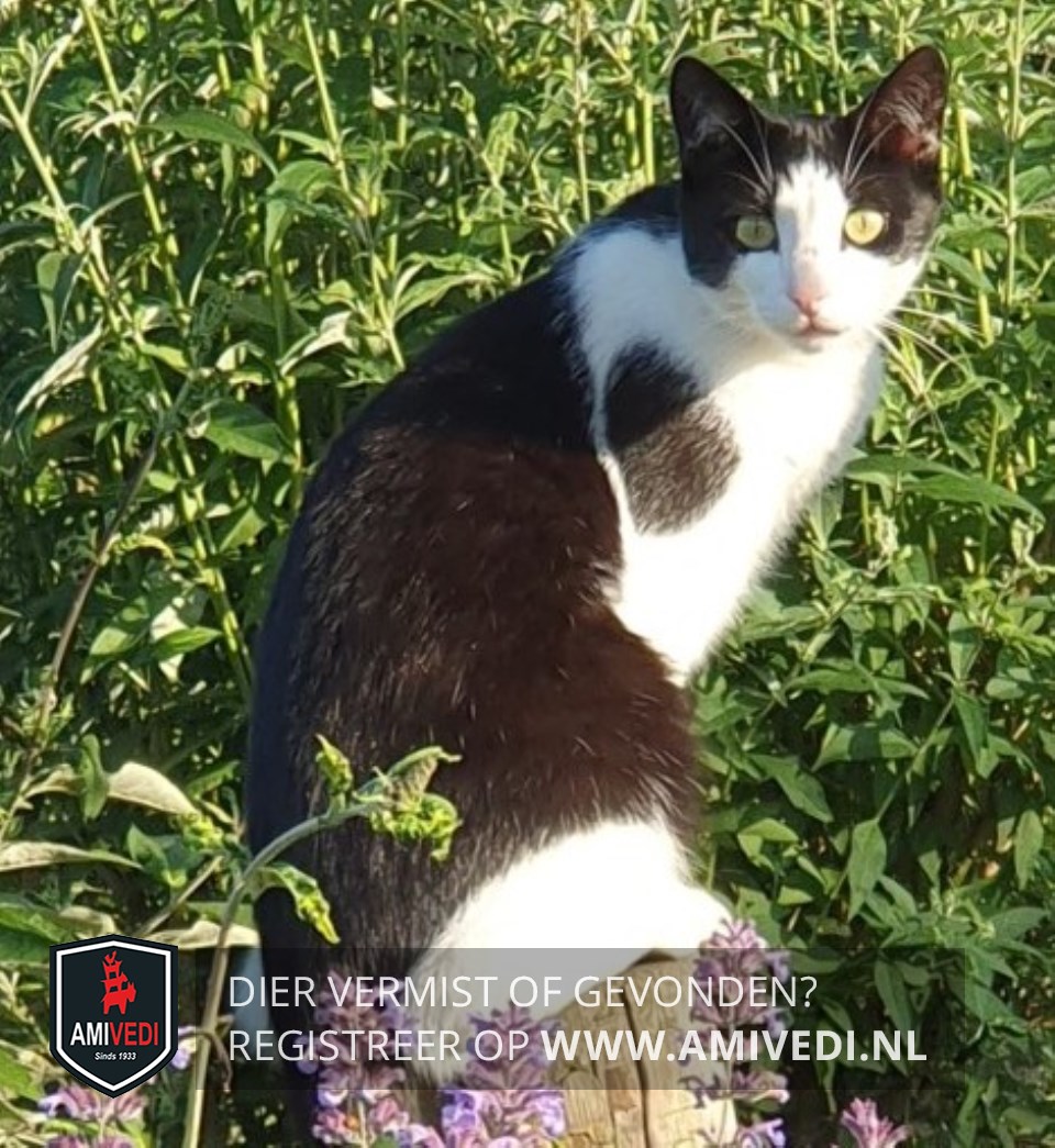 | Signalement | Zwarte pet, rug, staart, witte bles, bef, kin, borst, pootjes. Ronde zwarte vlek op rechterschouder. |
