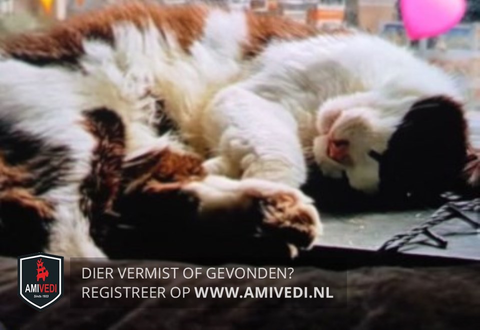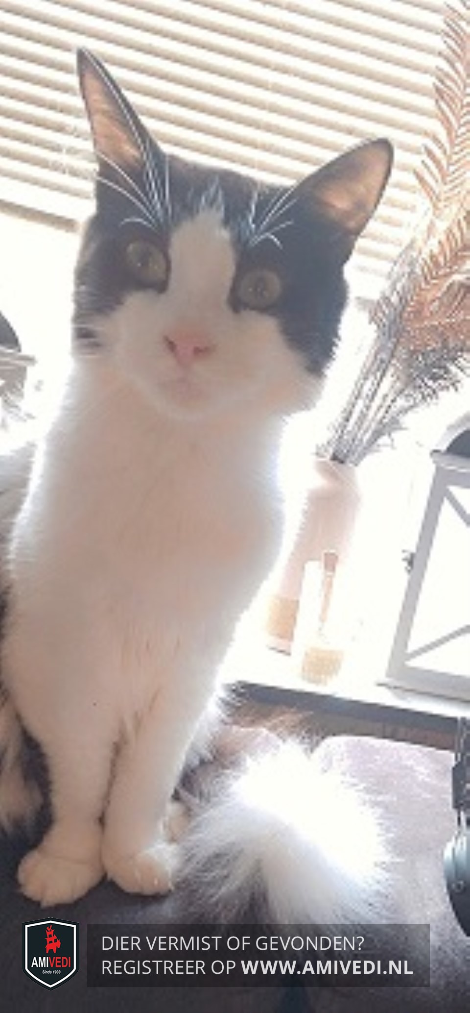 | Signalement | Klein wondje op zijn neus, groengele ogen, witte bles doorlopend naar de wangen, mond, volledige borst, voorpoten en buik, zwarte pluizige (Maine Coon) staart eindigend in een witte punt. |