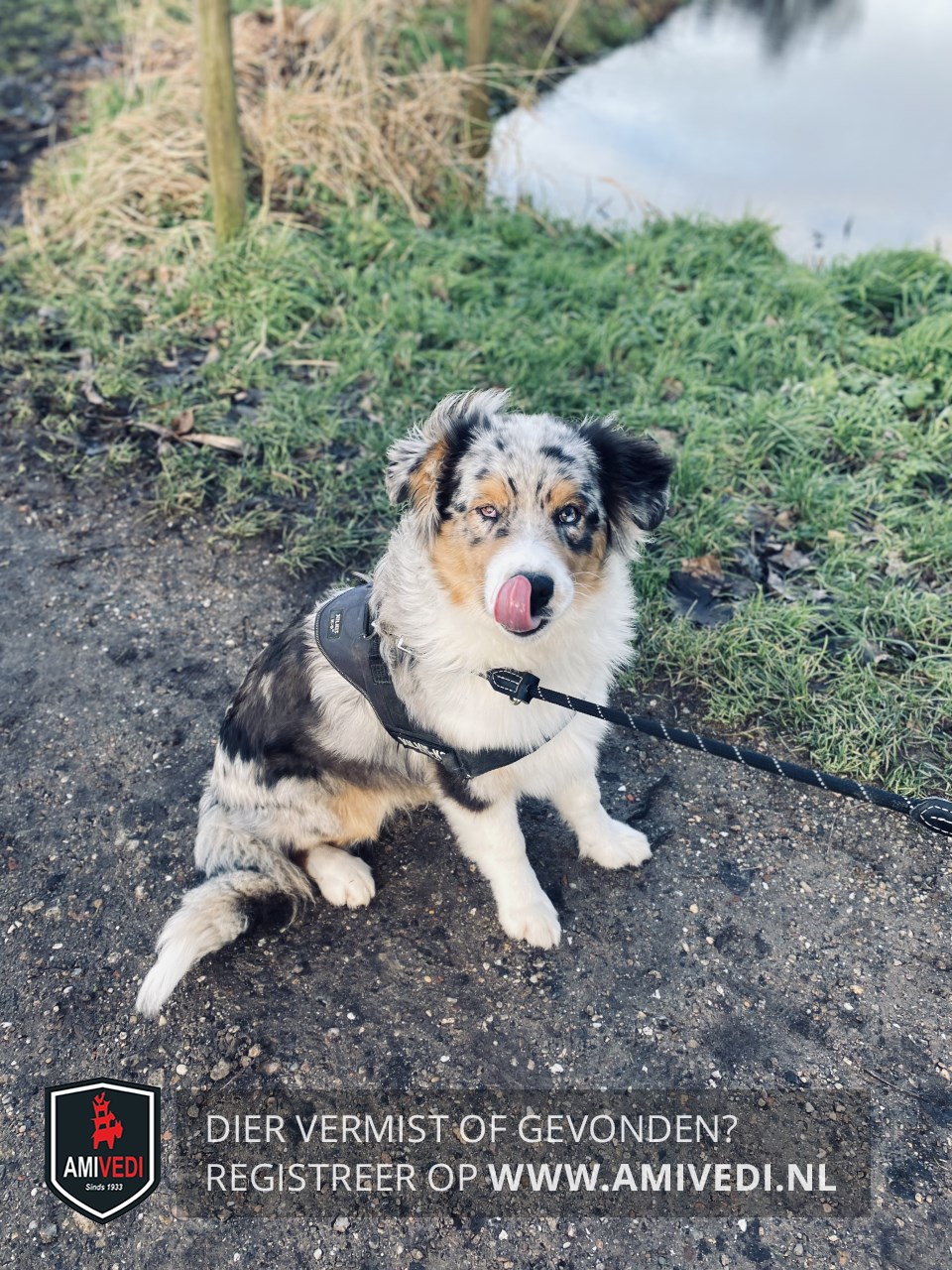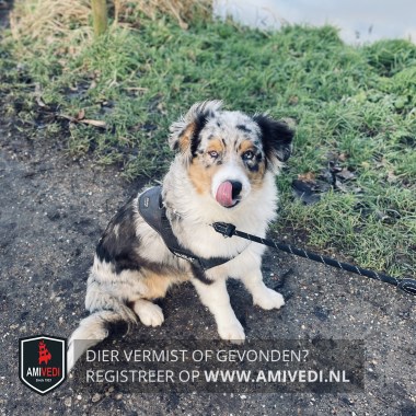 | Signalement | Australian shepherd blue merle. Snuit, keel, borst en voorpoten wit. Bovenop de kop wit met zwarte stippels. Wangen bruin. Onder linkeroog zwarte vlek die in een boog loopt. Linker oor voornamelijk zwart. |