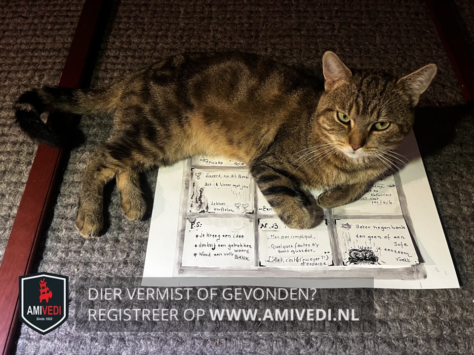| Signalement | Volledig cypersgrijze kater met brede gemarmerde strepen, lichte bek, lichte smalle ringen aan het einde van de zwarte staart. |
