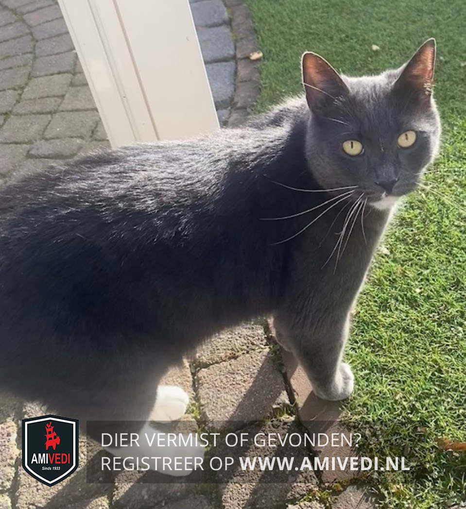 | Signalement | Grijs masker,wit sipje onder de neus,witte bek,witte bef,grijze rug en staart,grijze teentjes aan de voorpoten,grijze sokken aan de achterpoten. |