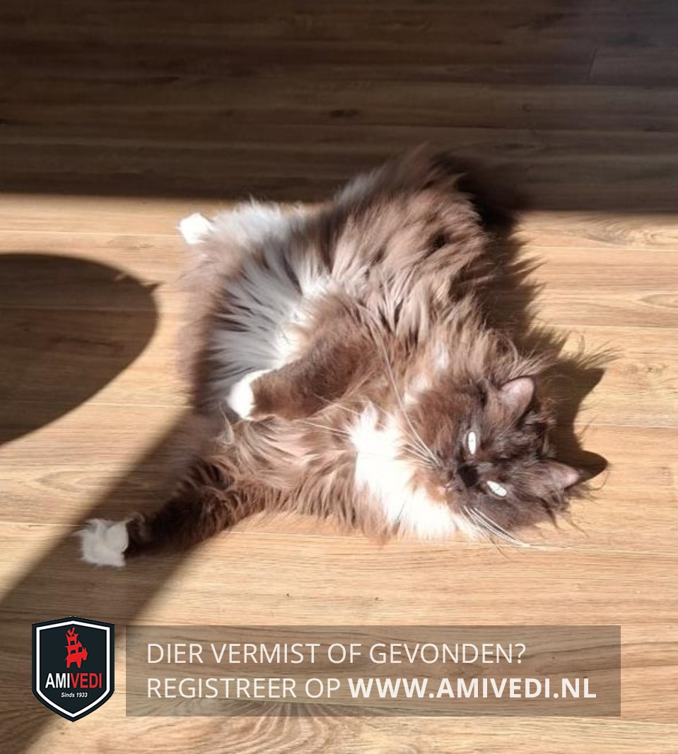 | Signalement | Ragdoll, donkerbruin met wit Witte borst, witte teentjes voor, witte vlek tussen de voorpoten op de buik, witte vlek op de buik tussen de achterpoten, witte voetjes achter. |