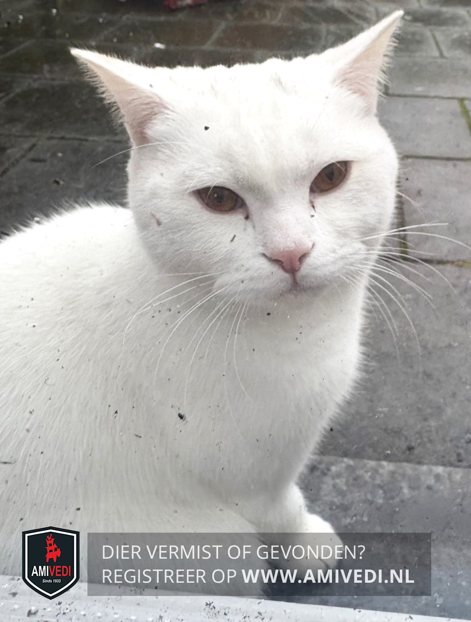 | Signalement | Wit met een paar zwarte haartje op de kop, bruine ogen, roze neusje. |