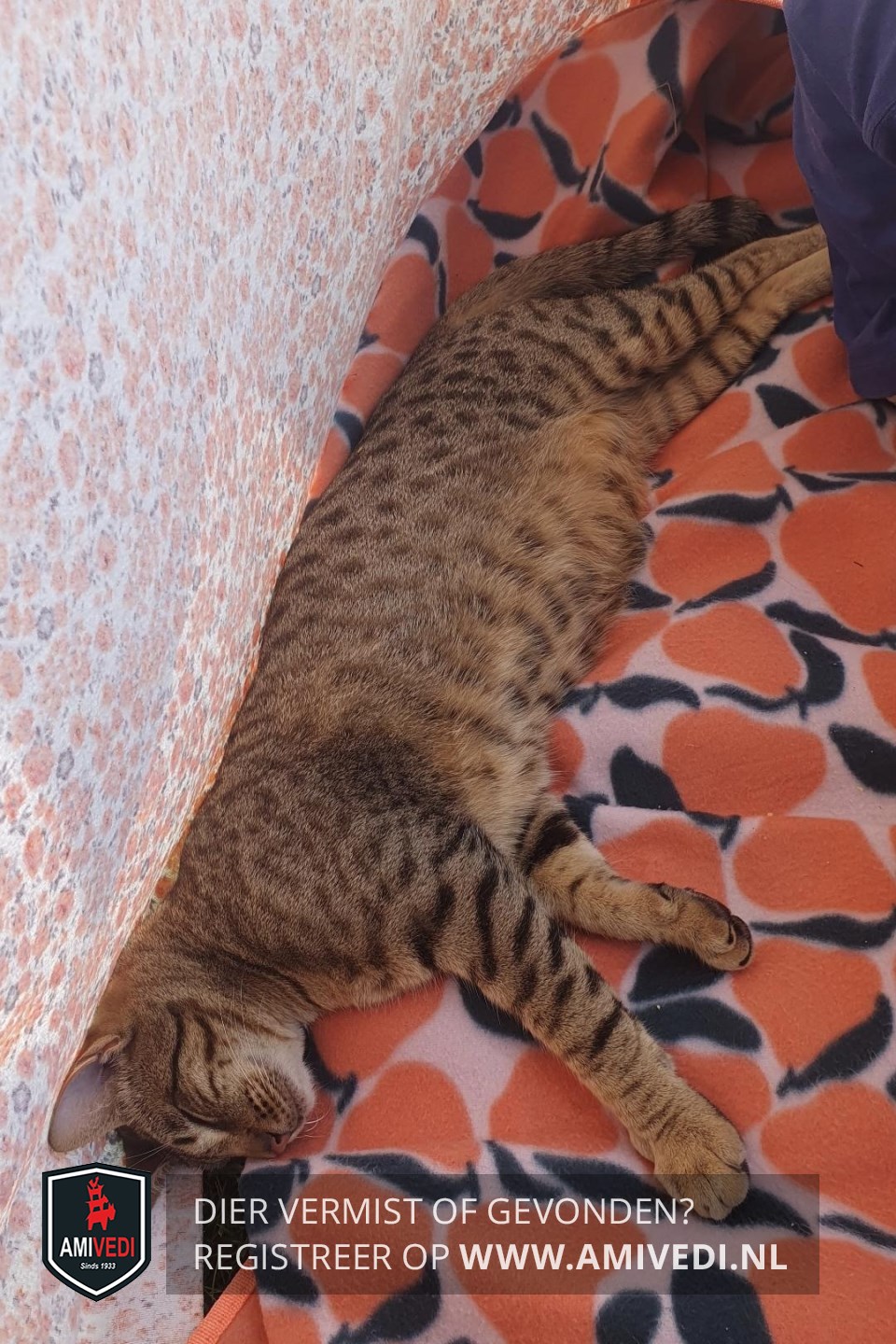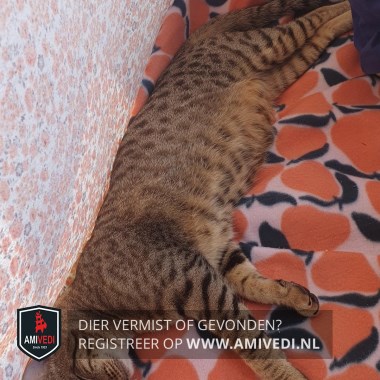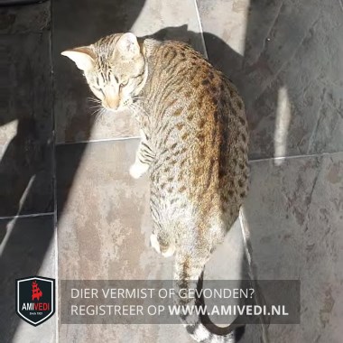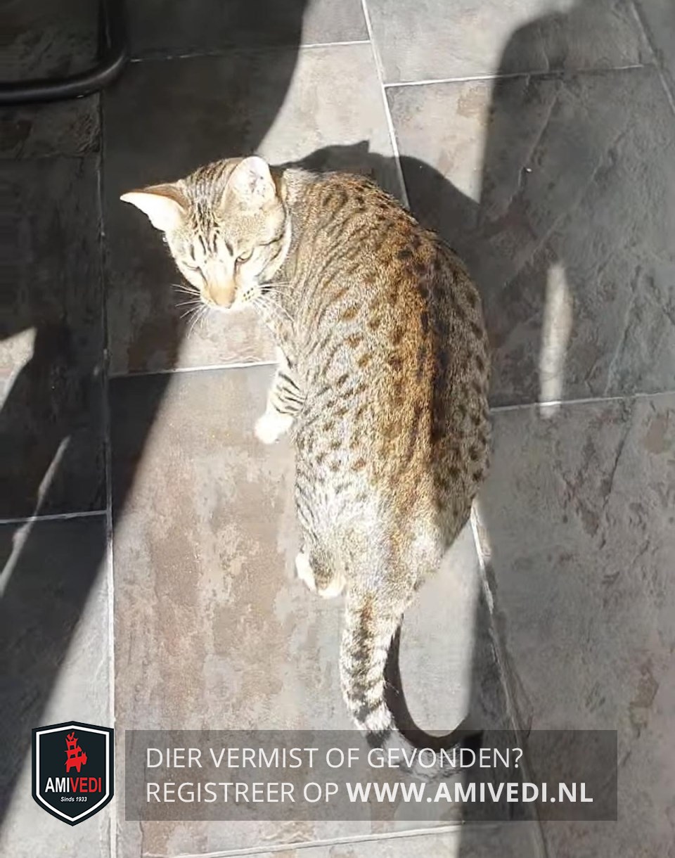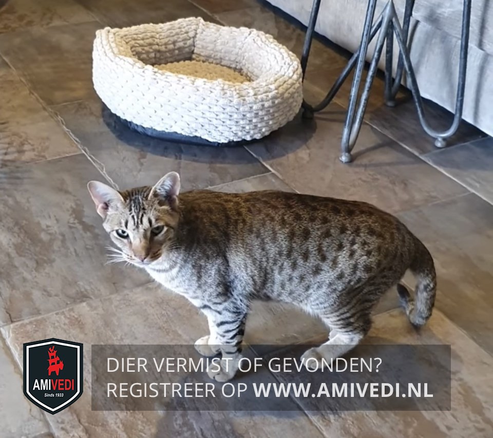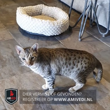 | Signalement | Ocicat, bruin/grijze vacht met zwarte stipjes en vlekjes op zijn rug. Spits snoetje met bruin boven de neus, beige borst. Voorpootjes beige sokjes en bovenkant beige/grijs met zwart gestreept. Achterpootjes beige kniekousjes en bovenkant beige/grijs met zwart gestreept. Staart beige/grijs met zwart gestreept eindigend in zwarte punt. |