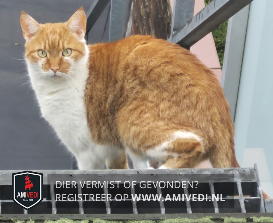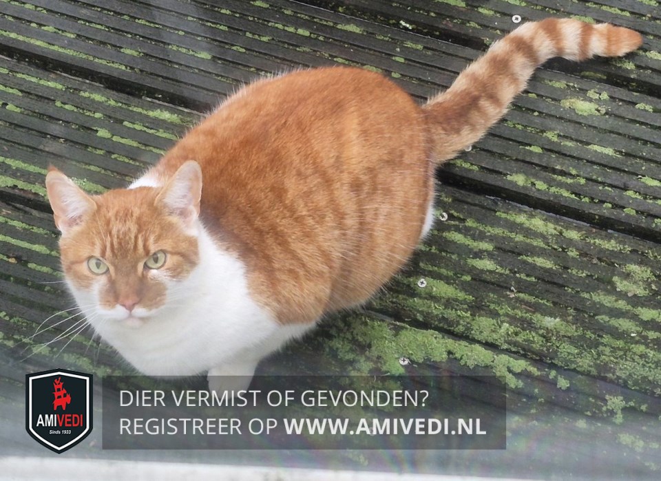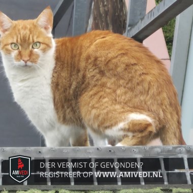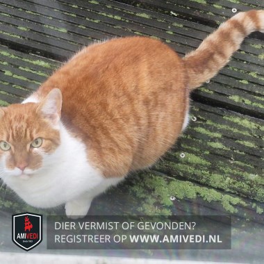 | Signalement | Rood/oranje gestreept met wit. Voornamelijk rood/oranje gestreept, vanuit de ooghoeken een witte streep loopt rond de snoet naar het neusje, roze neusje, witte kin, hals, borst doorlopend over de nek en naar de onderkant, linker voorpoot wit, rechter voorpoot meest wit met aan de achterkant cypers rood, onderlijf wit, achterpoten wit en cypers rood met links een witte kous, staart cypers geringd. Zichtmelding! Grote kat. |