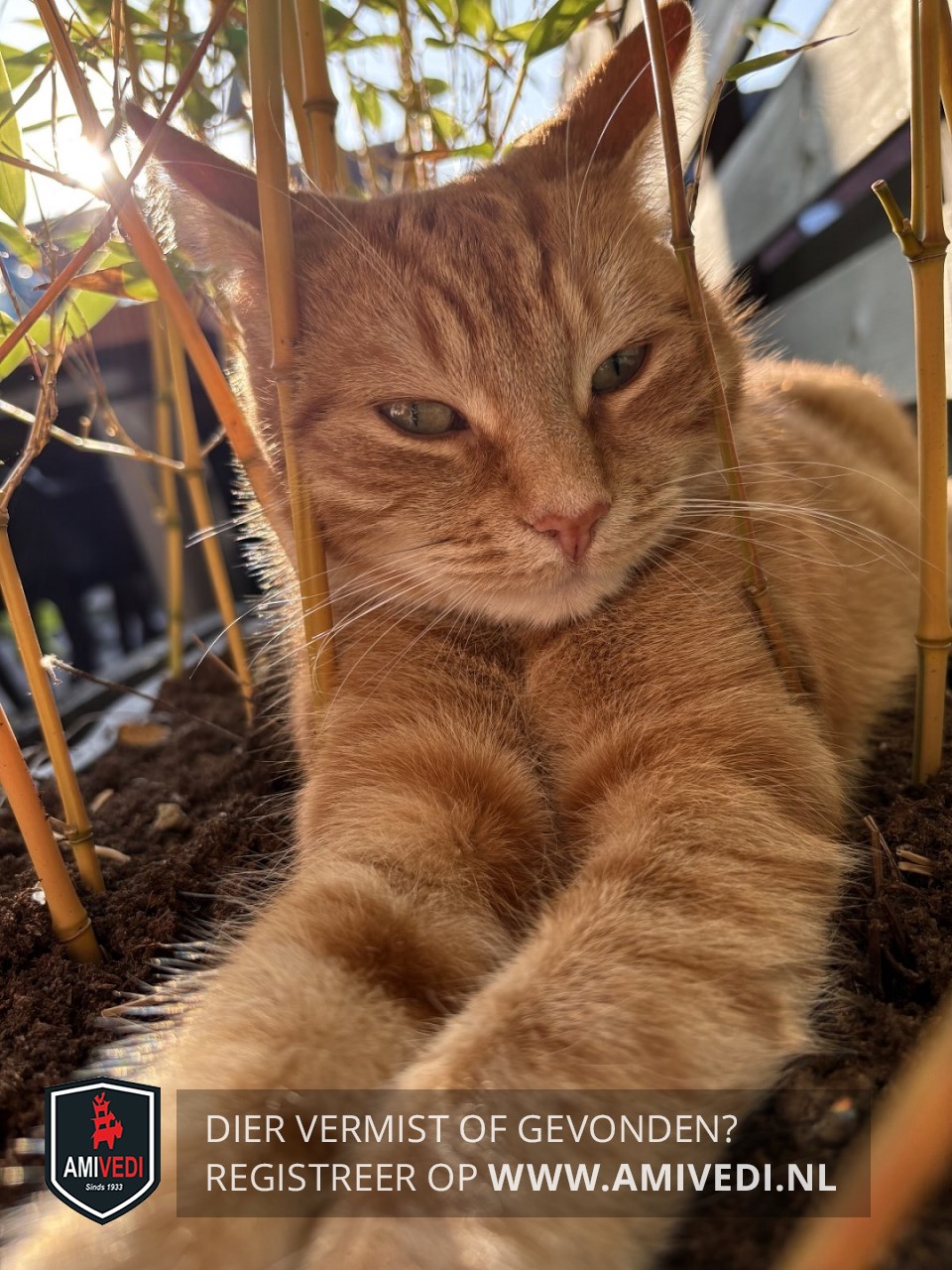 | Signalement | Cypers rood/oranje gestreepte kat met groene ogen. |