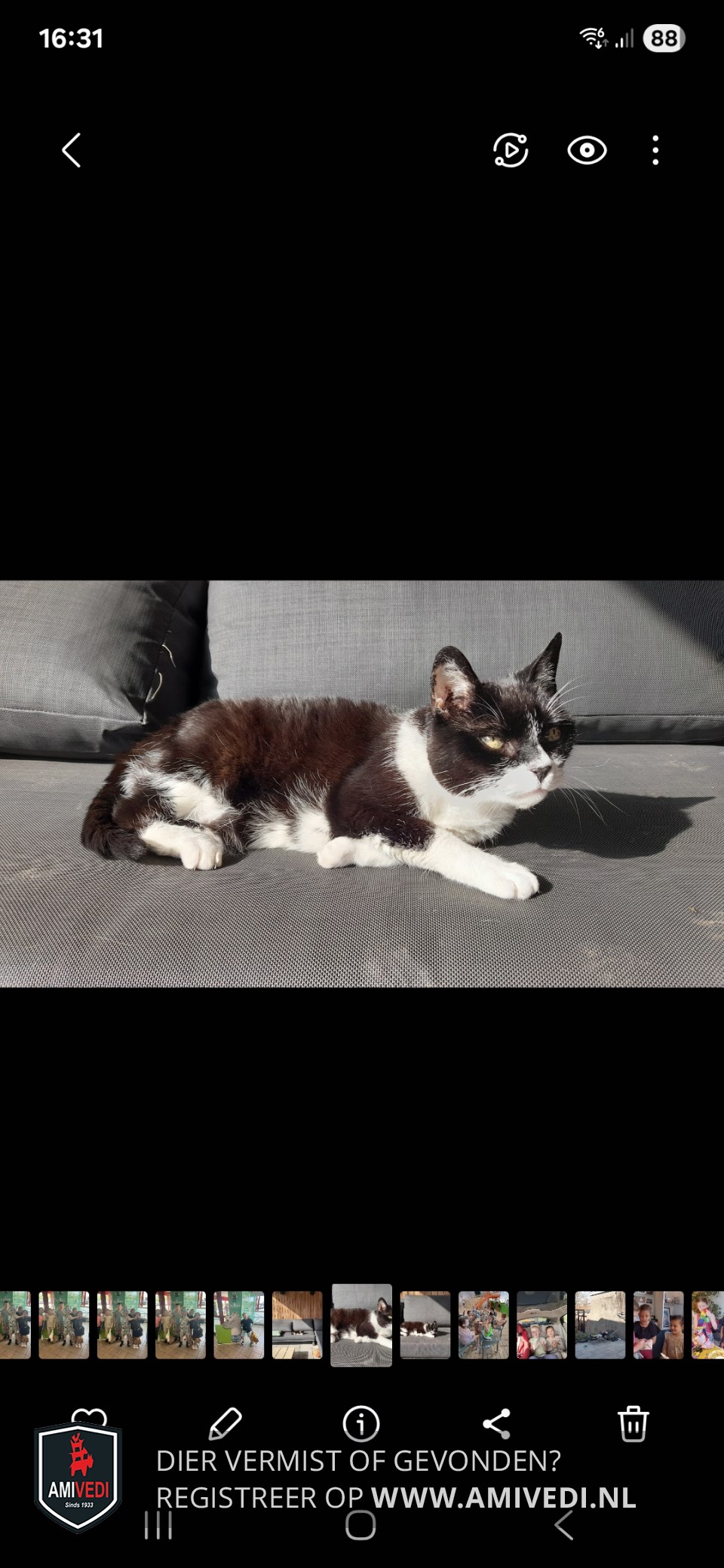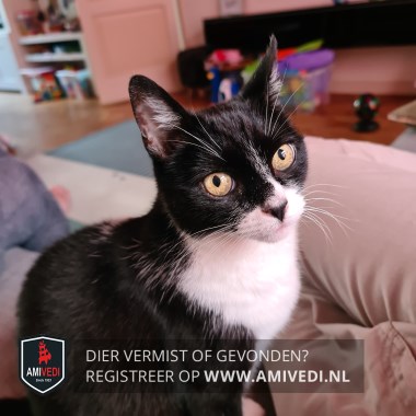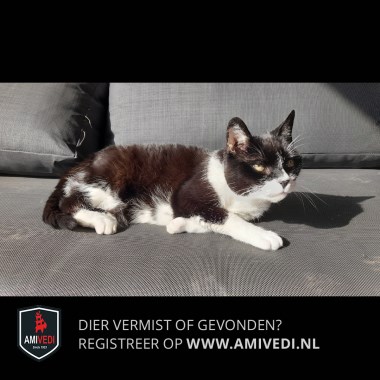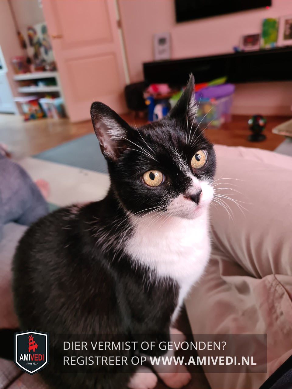 | Signalement | Zwart-witte poes met een zwart neusje en een hangbuikje. |