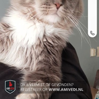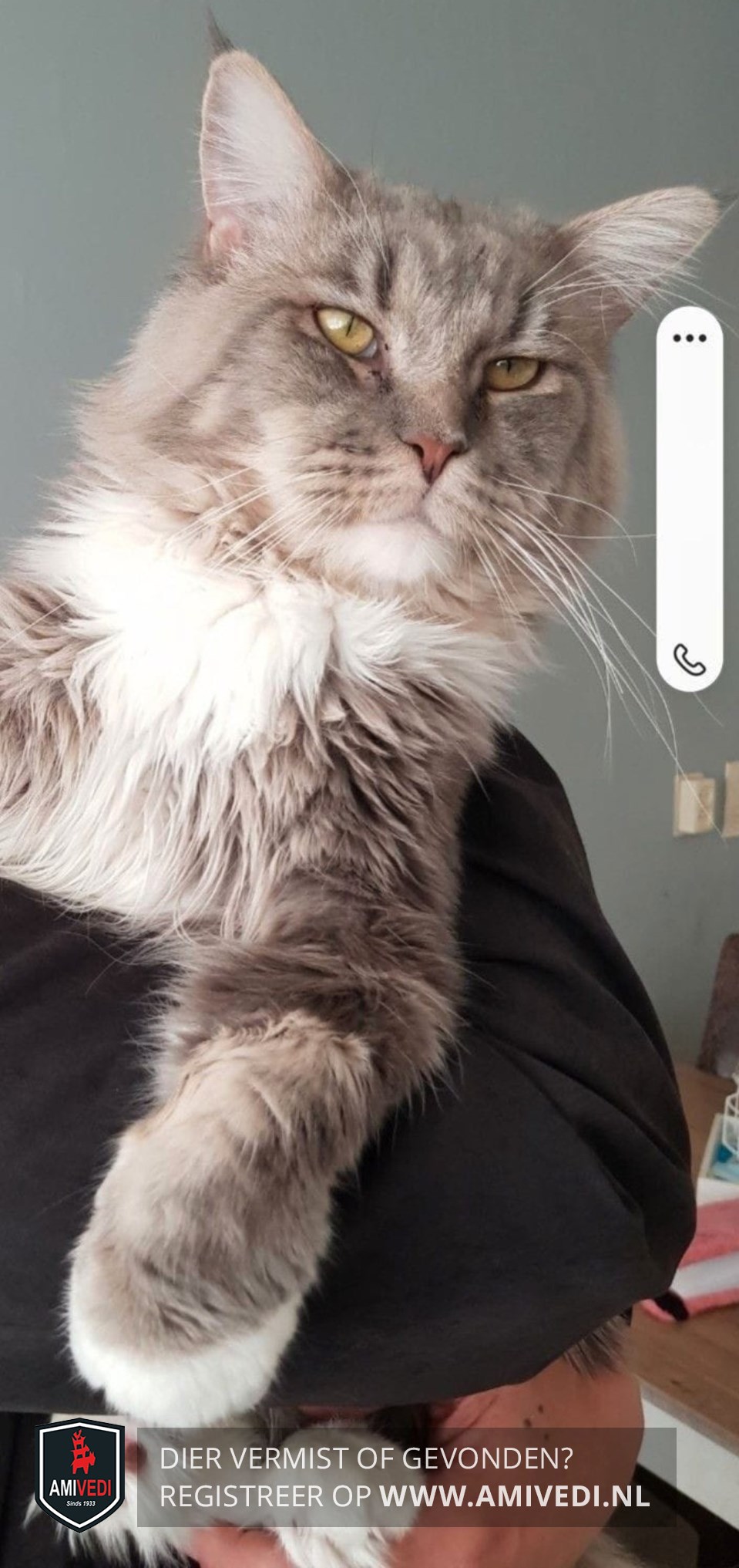 | Signalement | Cypers grijs/witte gestreepte langharige kat met een witte kin en een witte borst en een beetje wit aan de voeten. |