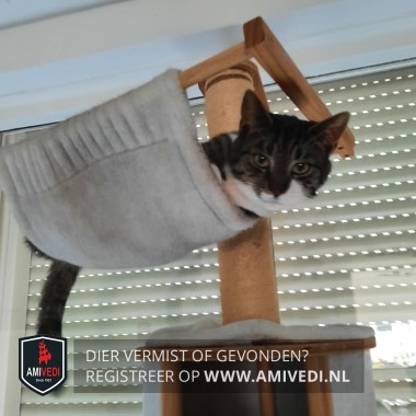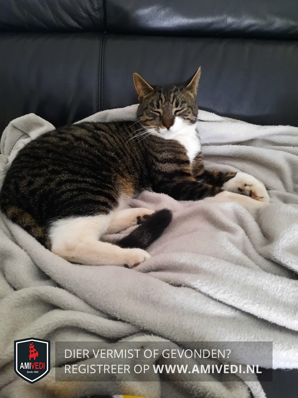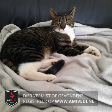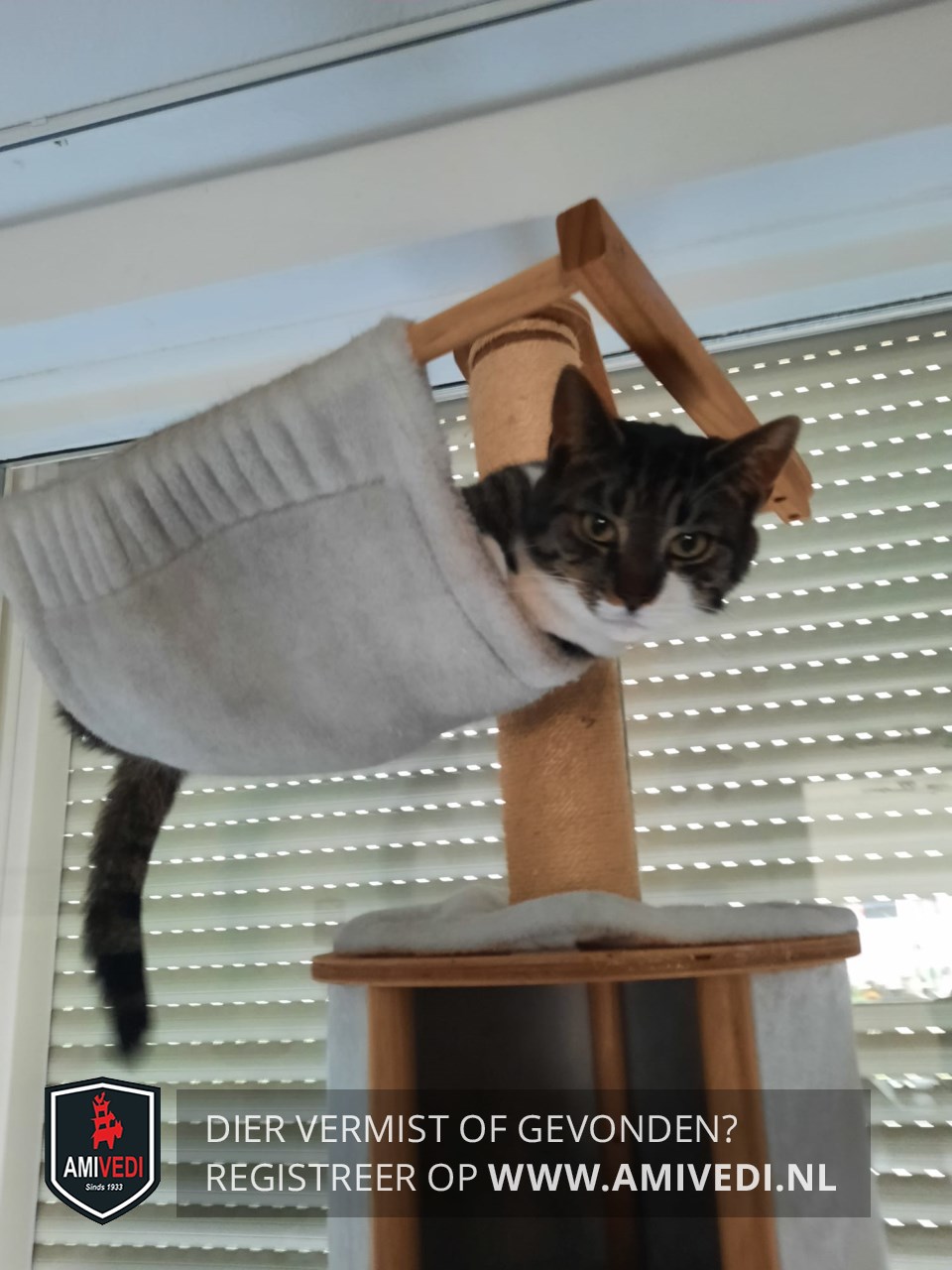 | Signalement | Cypers grijs/zwart gestreept, witte kin, borst, voorste witte sokjes, achterste witte pootjes. |