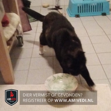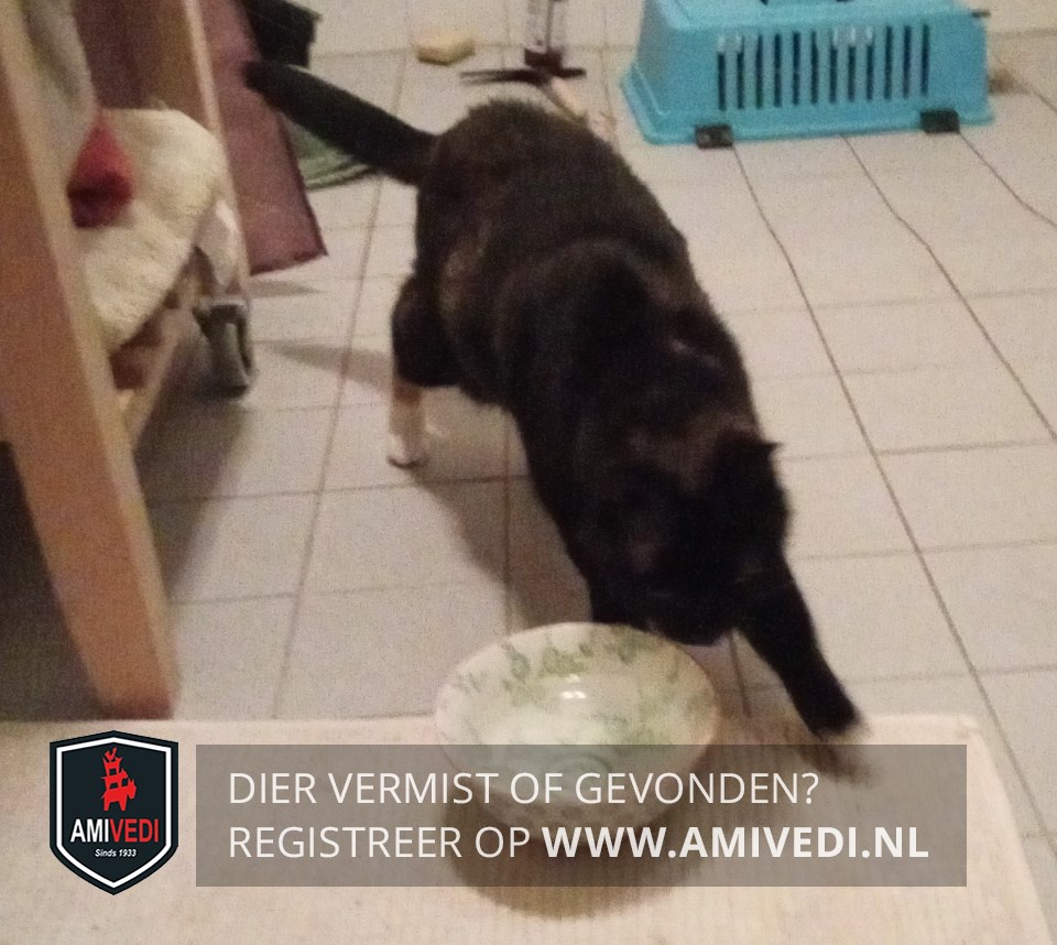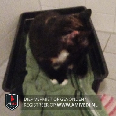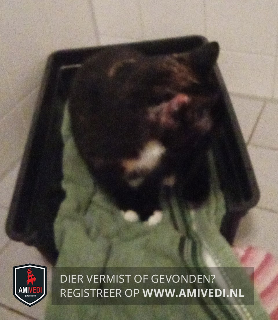 | Signalement | Schildpad zwart - rood met witt, witte borst, witte tenen voorpoten, wit sokje rechter achterpoot, wond achter het rechteroor. |