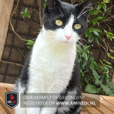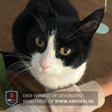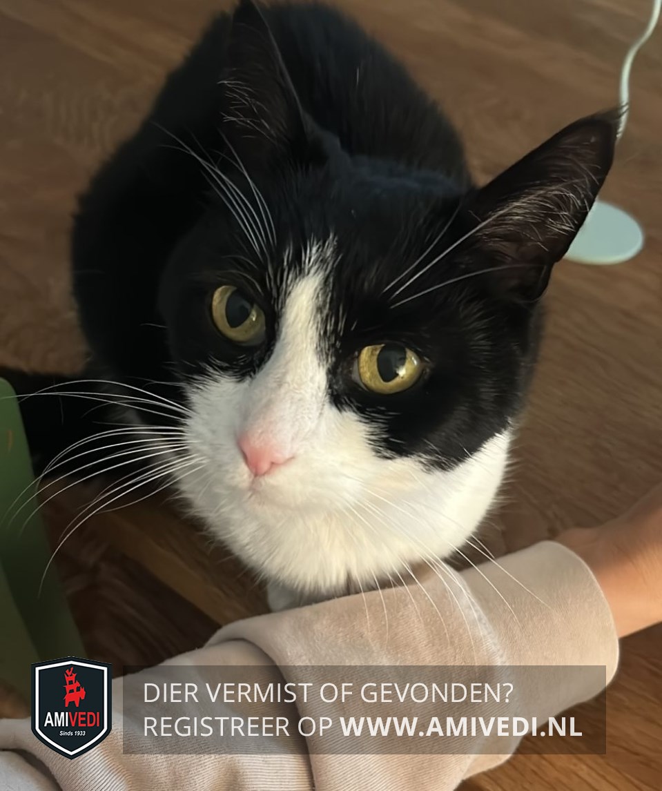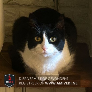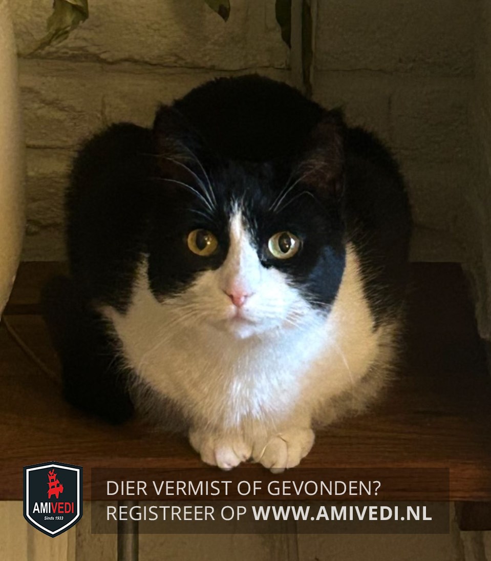 | Signalement | Zwart wit, roze neusje, zwart op de kop tot over de ogen, witte onderkant en poten. |