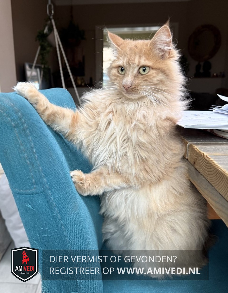 | Signalement | Rood-oranje gemêleerd, langharig met lichtere pootjes. |