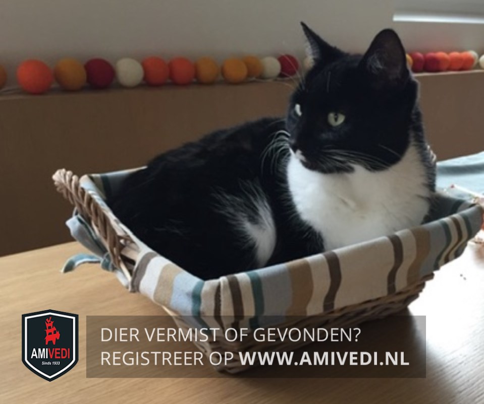 | Signalement | Zwarte poes. Witte borst en witte buik. Onder de snuit witte plekjes. Angstig. |