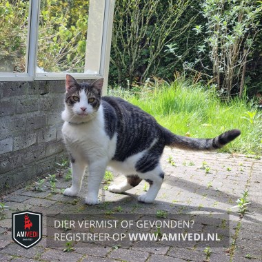 | Signalement | Cypers bruin-grijs/zwart wit tussen de ogen en witte snuit, roze neusje, witte kin, bef, borst , buik en pootjes, op achterpootjes enkele buin-zwarte plekjes, klein bruin vlekje onder neus aan linkerzijde, kapotte lip links, scheurtje in linker, gele ogen. |