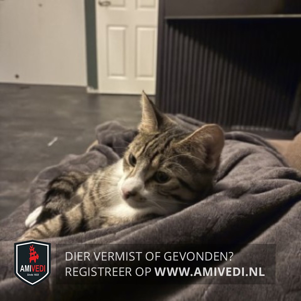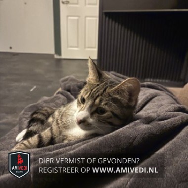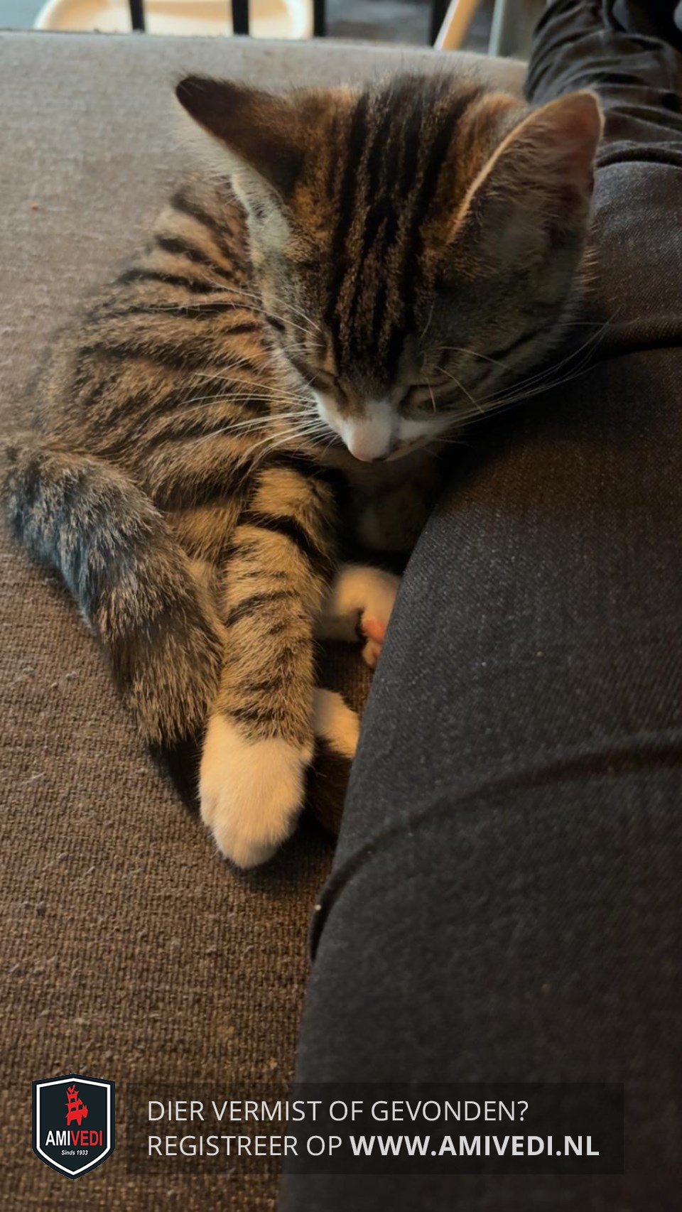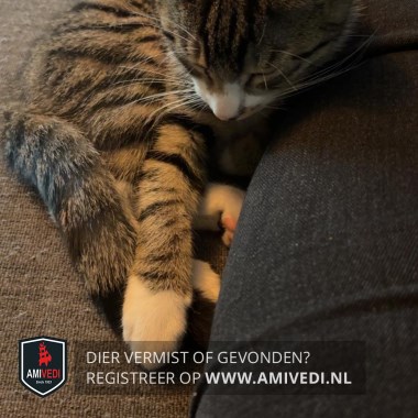 | Signalement | Grijs/zwarte cyperse kitten-M van 6 maanden. Wit snuitje met aan linkerzijde van de neus een bruin vlekje. Witte kin en bef. Geringde zwart/grijze staart met zwart uiteinde. Wit sokje linkerachterpoot. Wit voetje rechtervoorpoot. |