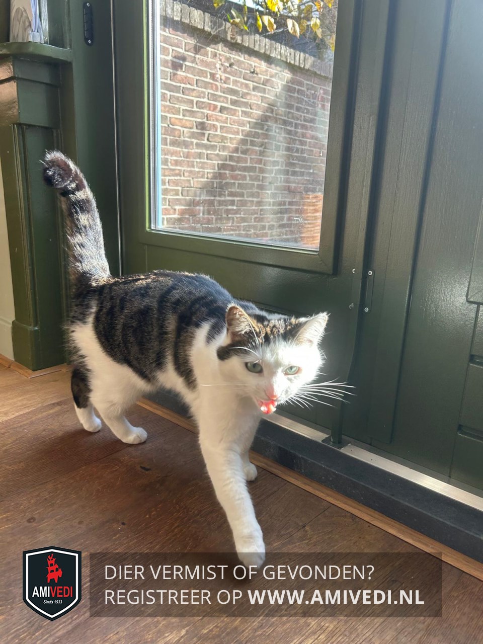| Signalement | Wit/cyperse. Cypers bij oren en langs rechteroor. Helder blauw/groene ogen. Heeft een halsband om met 'niet voeren' en een kokertje met 06- nummer erin. Cyperse op rug en flanken. Linkerachterpoot witte sok. Cyperse staart. |