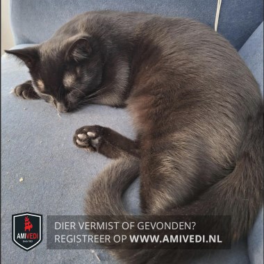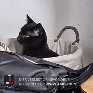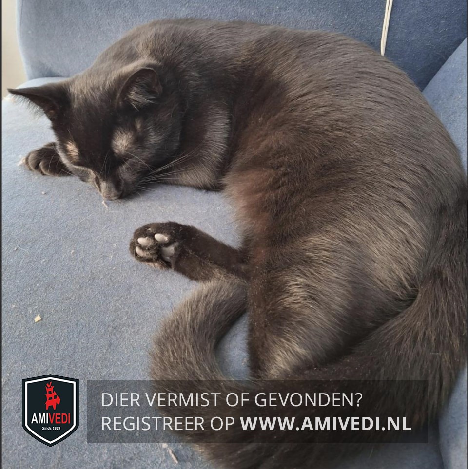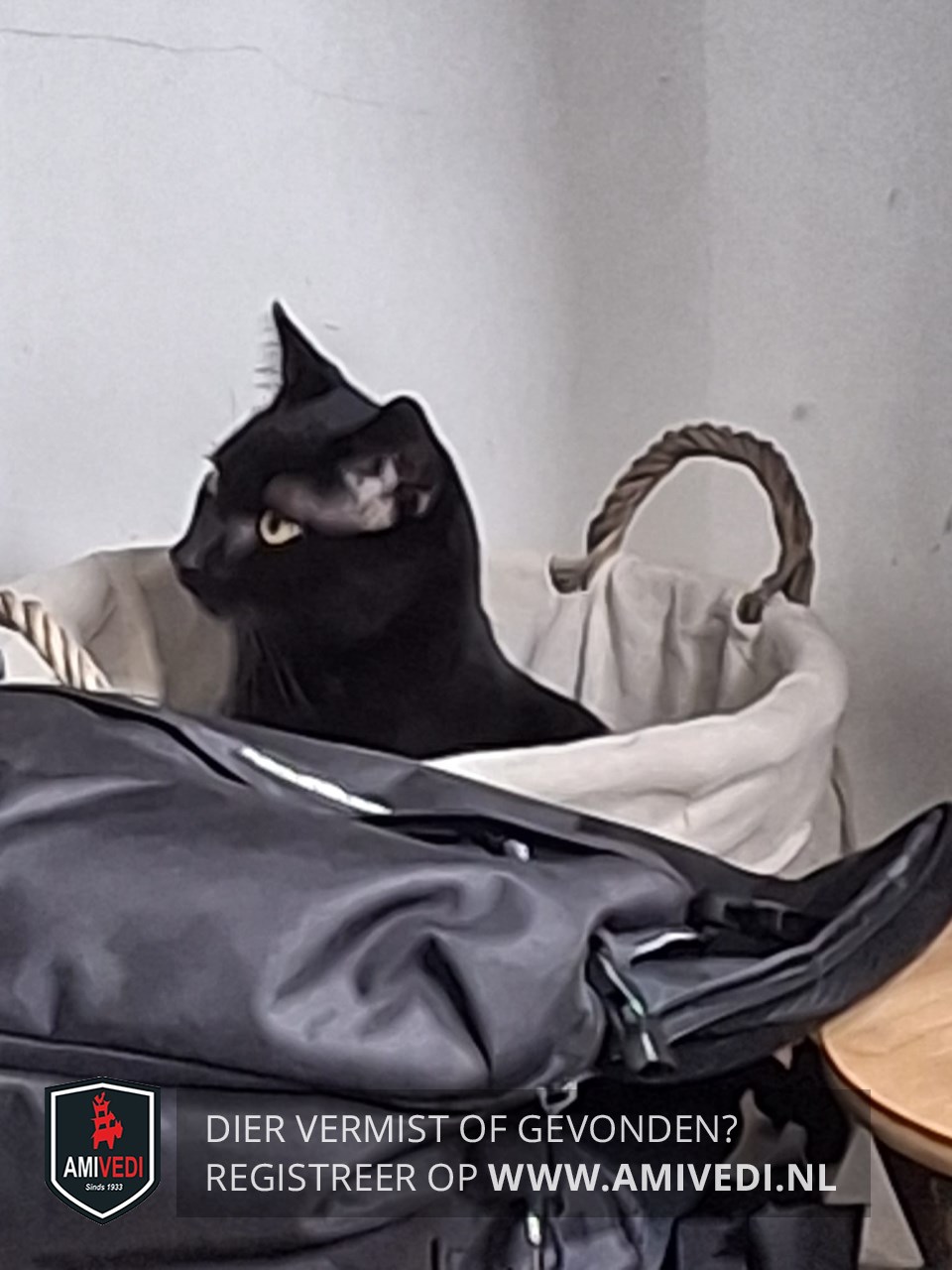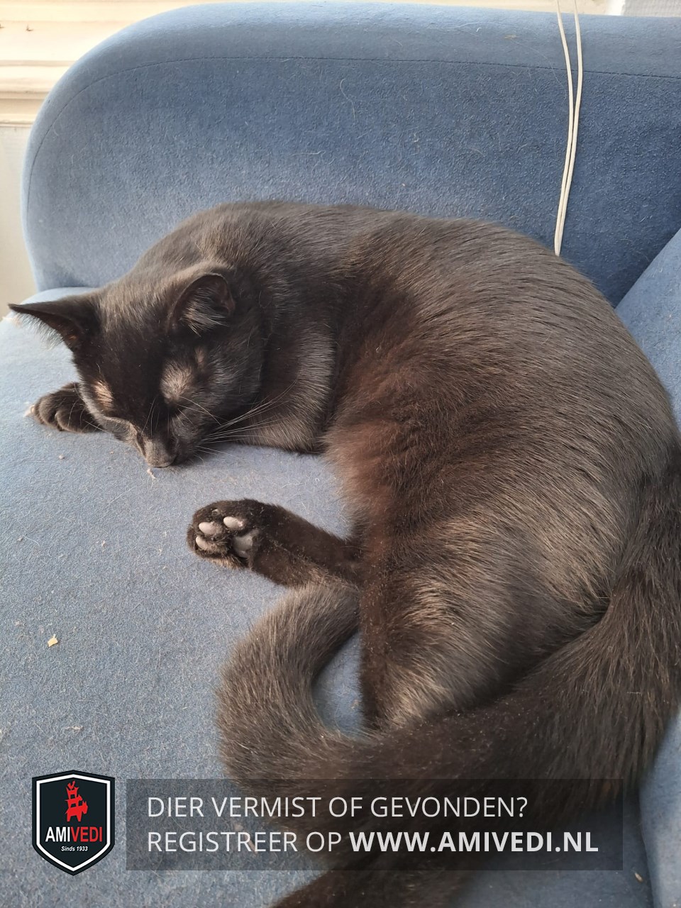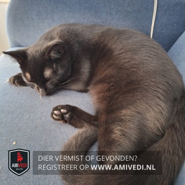 | Signalement | Zwarte Jonge kat. Egaal zwart met wat wit op de borst. Weinig haar tussen ogen en oren. Klein bruin plukje bijna halverwege de staart. |