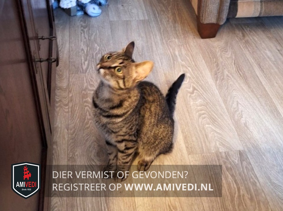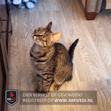 | Signalement | Cypers bruinzwart gestreept, lichter op de bef, een zwart cyperse staart, is klein, jongvolwassen en luistert naar haar naam Sterre. |