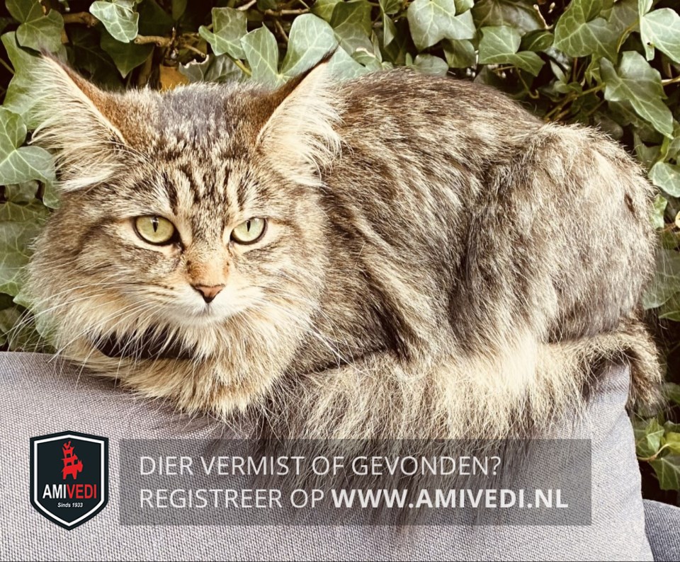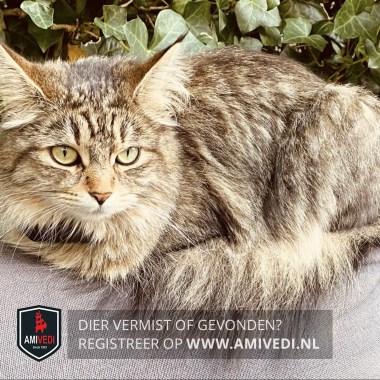 | Signalement | Cypers bruin-zwart gestreepte half langhaar. Maine Coon (x) brown tabby. Groen/gele ogen. Pluimstaart. |