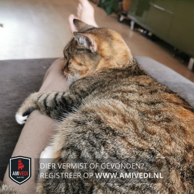 | Signalement | Cypers bruin/zwart met wit en rood/oranje. Een rood/oranje punt aan haar staart en de rest van de staart is grijzig en zwart. Haar staart heeft een skelet markeringen die over haar staart en rug loopt. Witte borst. Linker voorpoot witte teentjes. Linker achterpoot witte sok. |