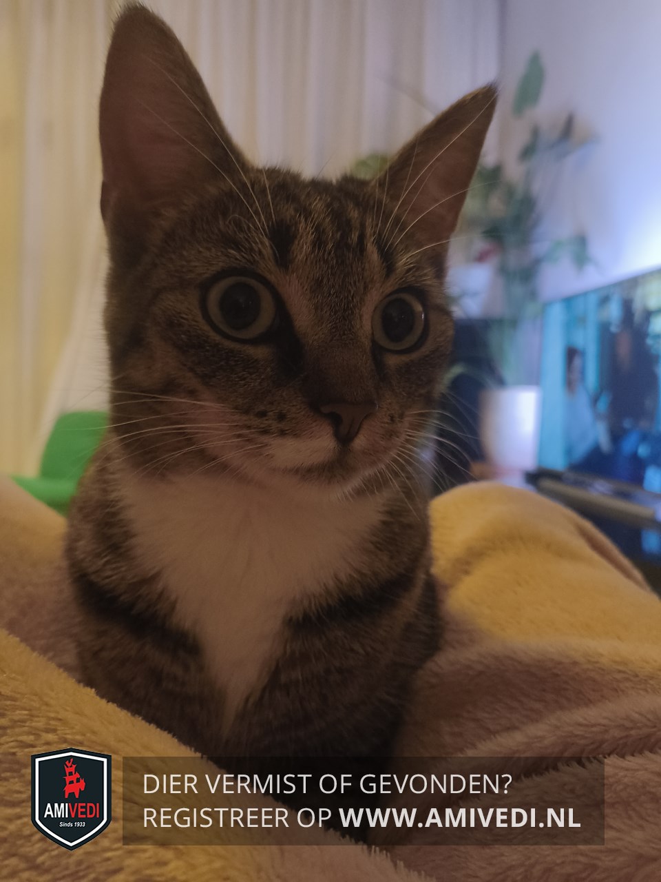 | Signalement | Cypers bruin/zwart met wit. Rechts onder de neus en rechts boven de lip een wit vlekje wat wit doorloop naar kin, bef en borst. Witte sokjes op alle poten. |