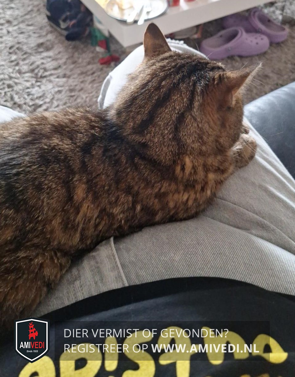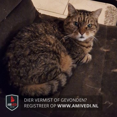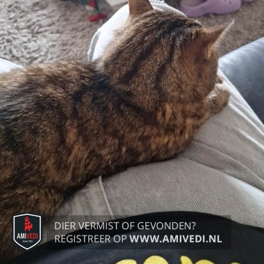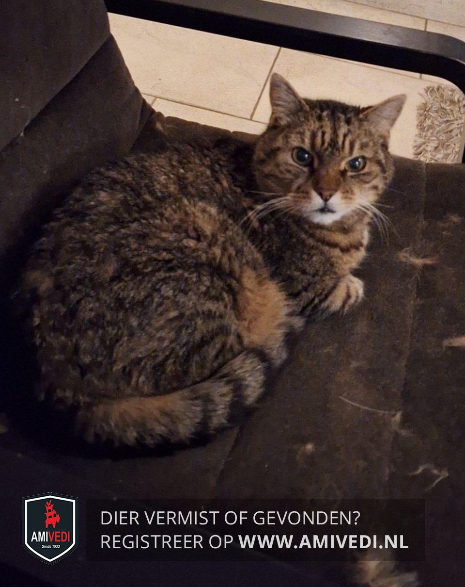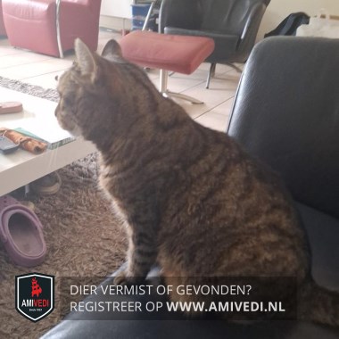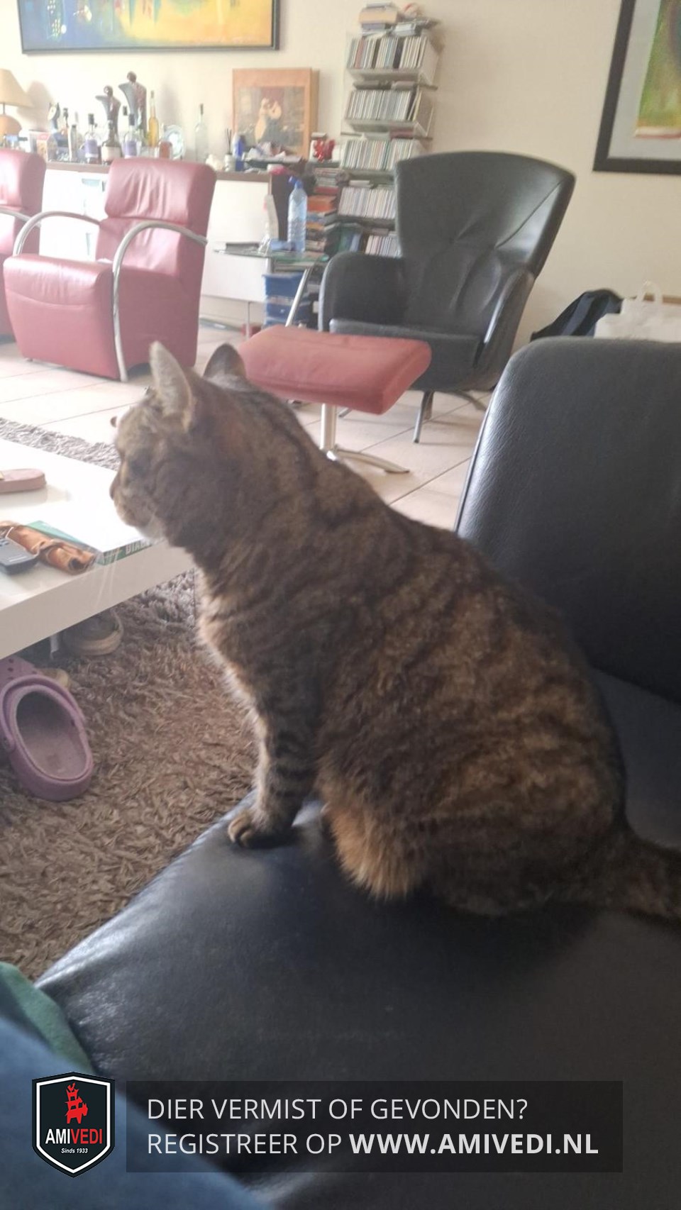 | Signalement | Bruin zwart gestreepte cyper, witte snor en witte kin en een klein wit vlekje op de borst. |