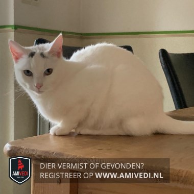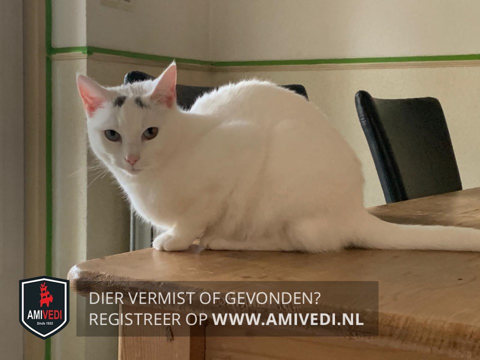 | Signalement | Geheel wit met 2 kleine zwarte vlekjes op haar kopje tussen de oren. |