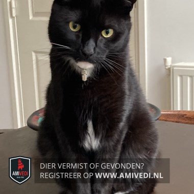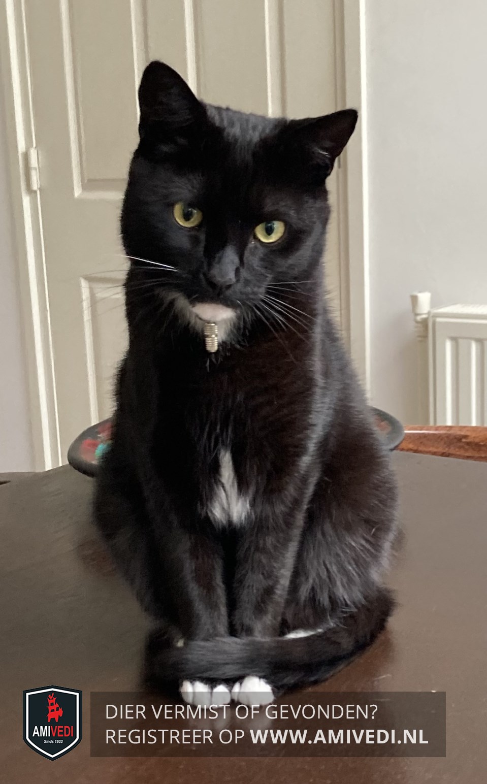 | Signalement | Zwart, wit kinnetje , witte vlek op de buik, witte teentjes. |