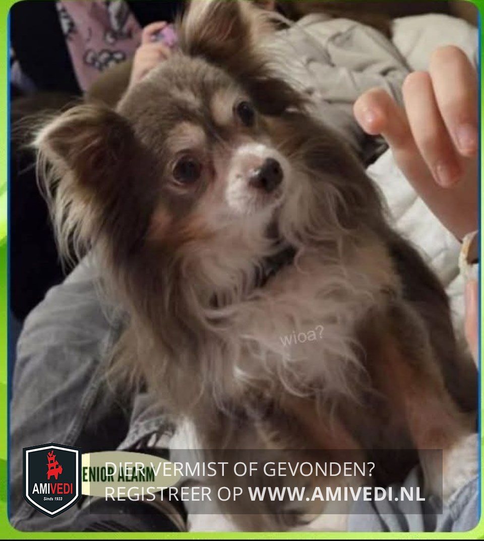 | Signalement | Bruin met beige. Langharig. Witte snuit met zwarte neus. Kop bruin. Beige wenkbrauwen. Beige keel, beige bef. Voorpoten beige voetjes. |