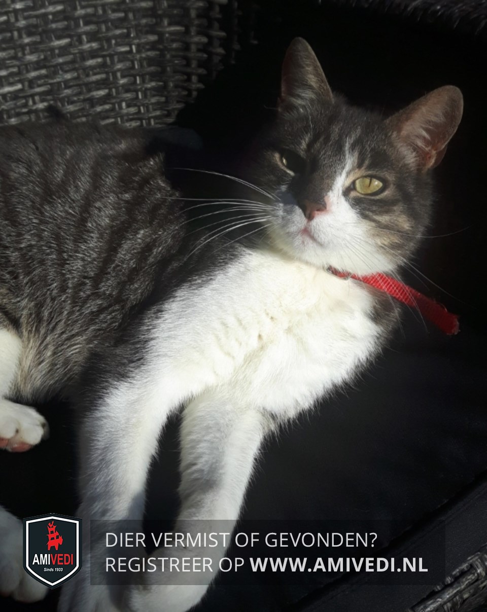 | Signalement | Cypers grijs-zwart met scheve, smalle witte bles, witte neus, bef, borst en voorpoten, achterpoten ook deels wit. |