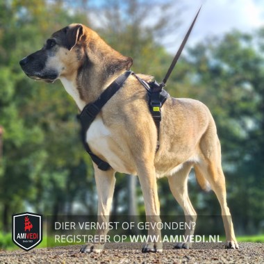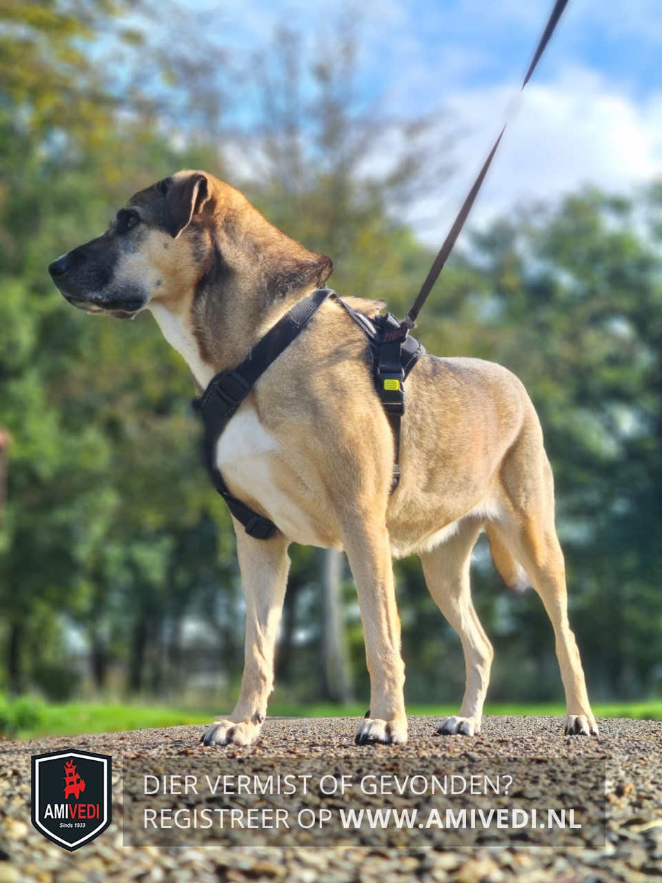 | Signalement | Bruine hond met wat zwart en wit. Zwarte snoet. Witte keel en borst. (Komt op eten af.) |
