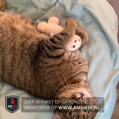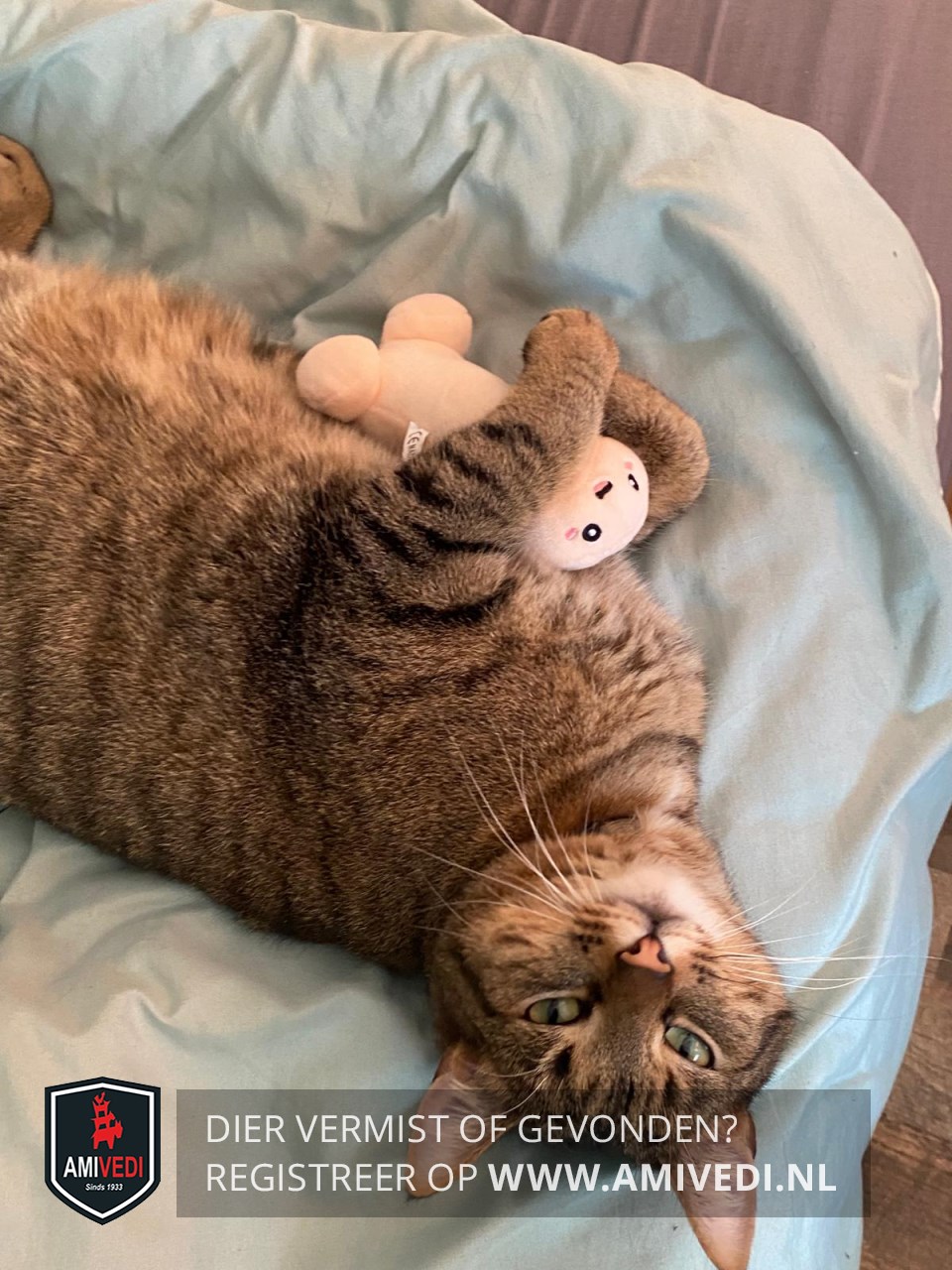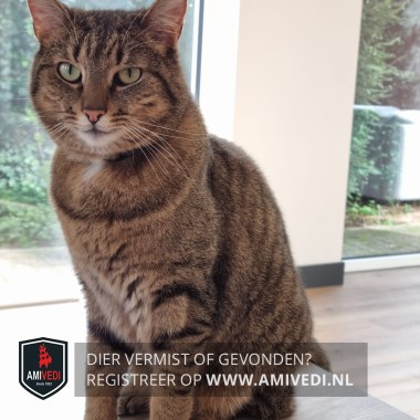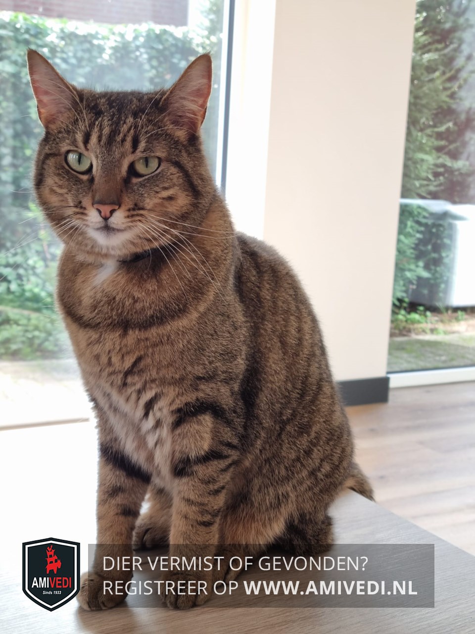 | Signalement | Cypers bruin zwart gestreepte kater met witte plekjes onder de neus, witte kin en klein plukje wit op de bef. Buikje beige kleurig met groene ogen. |