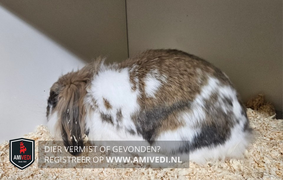 | Signalement | Bruine kop, met zwarte snuit. Witte kin, kraag en borst. Langharige, lange bruin/zwarte oren. Bruine rug met enkele zwarte en witte vlekken. Pootjes en buik wit. |