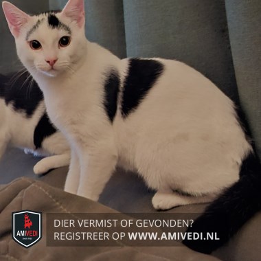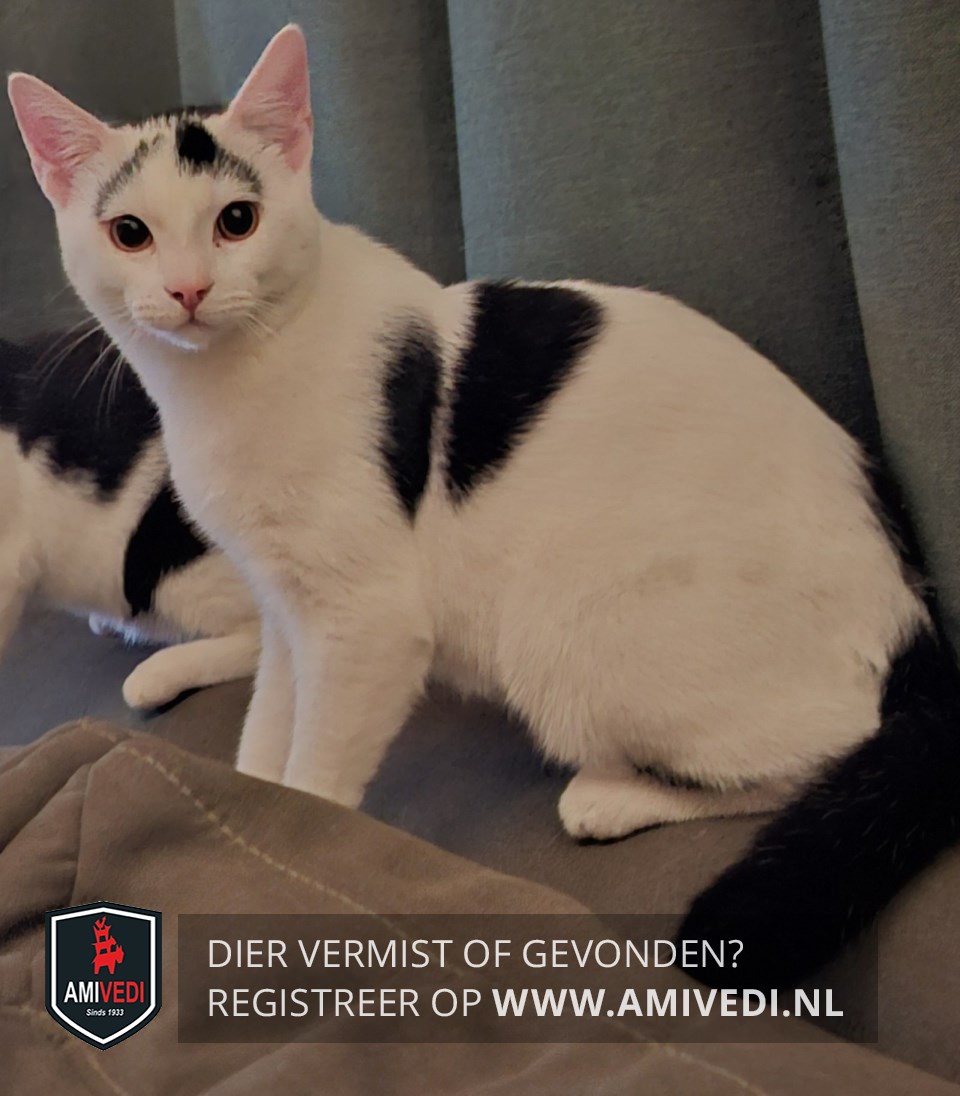 | Signalement | Wit/zwart. Witte poes met zwarte strepen op het hoofd en zwarte vlekken op haar rug. Zwarte staart. |