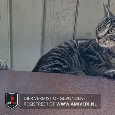 | Signalement | Cypers grijs/zwart gestreept, wit kinnetje. |