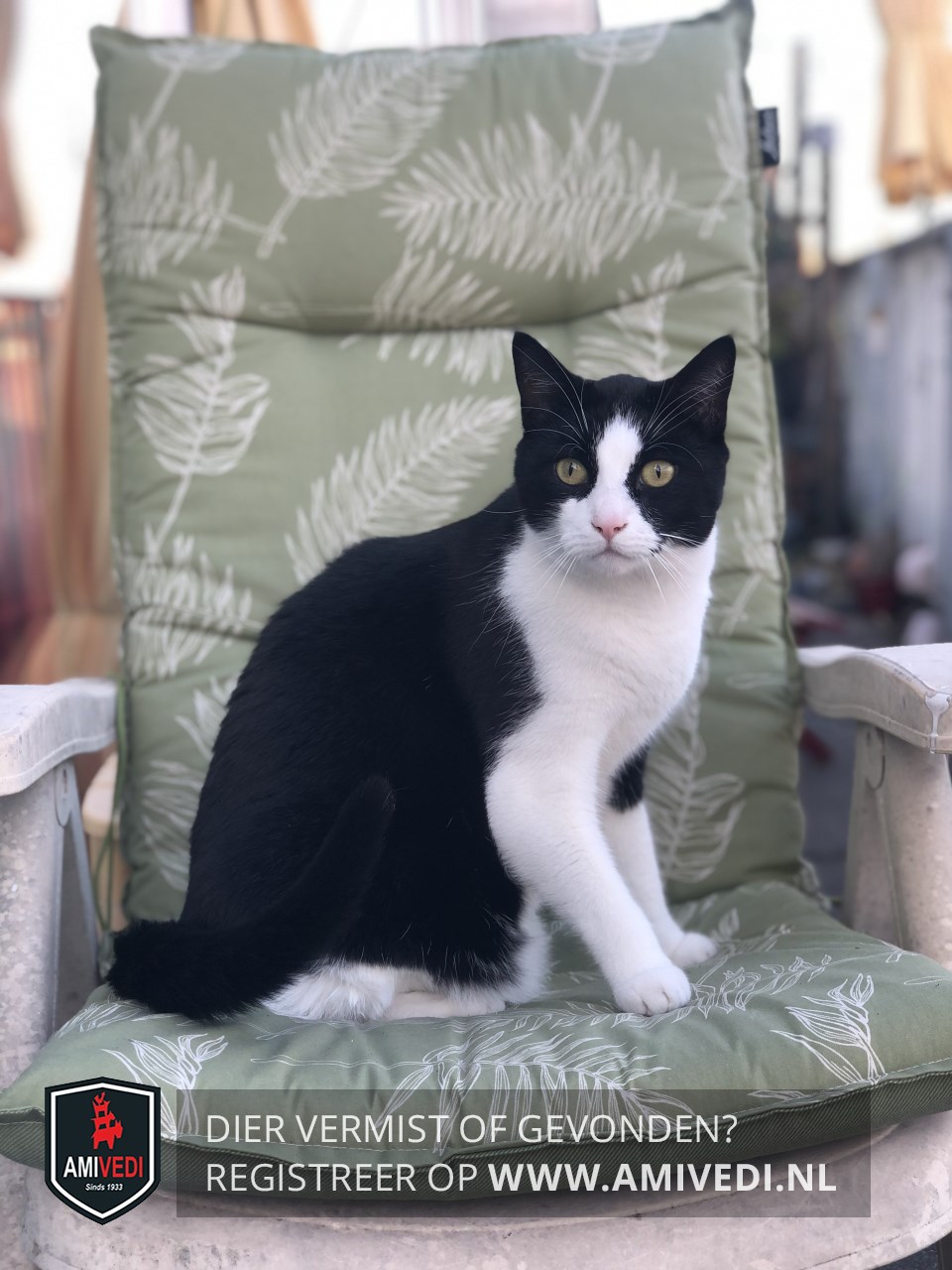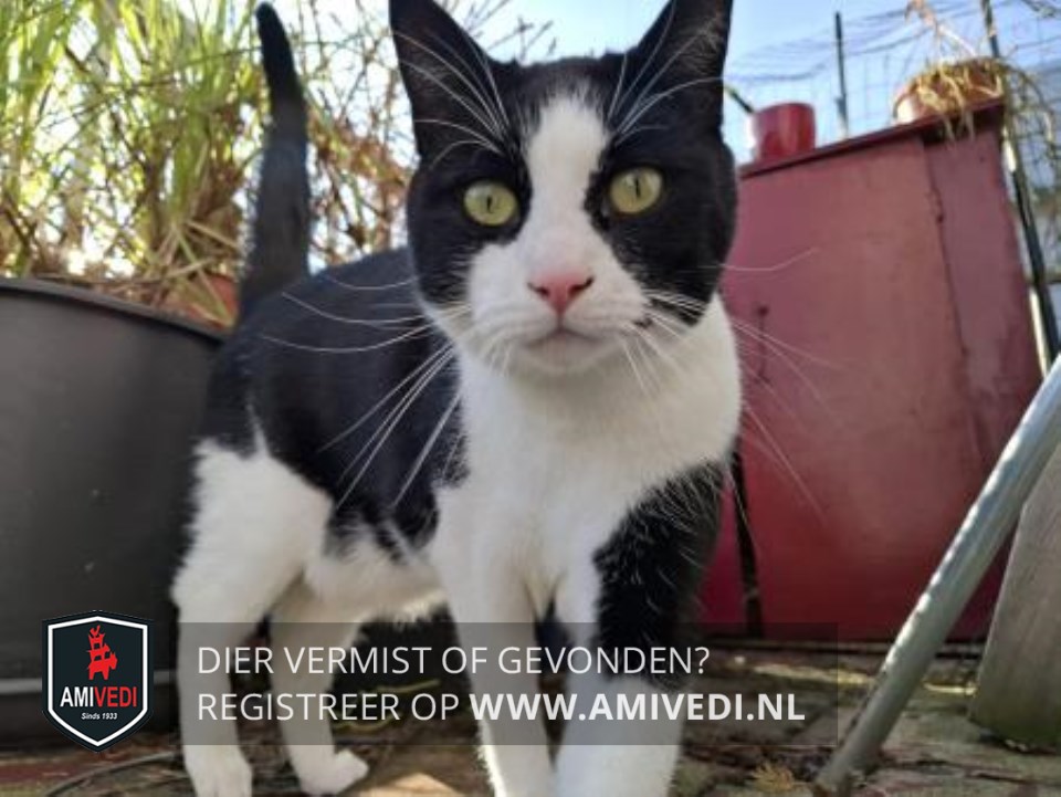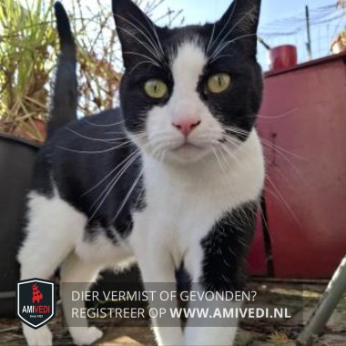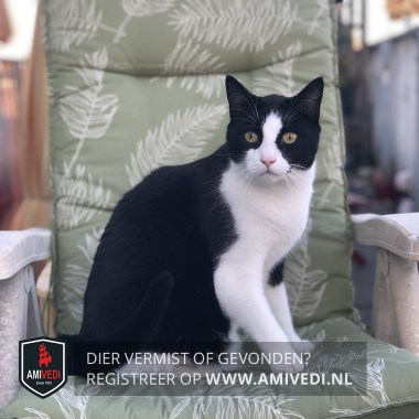 | Signalement | Zwart/witte kater. Zwart op het kopje dat doorloopt over en langs de oogjes. Witte neusbrug dat doorloopt naar het voorhoofd. Wit rond het bekje, roze neuspunt. Wit rond het bekje. Brede witte sjaal om de nek, witte borst, buik en pootjes. Zwarte vlek bovenin het linker voorpootje. Zwarte rug en flanken. Zwarte staart. |