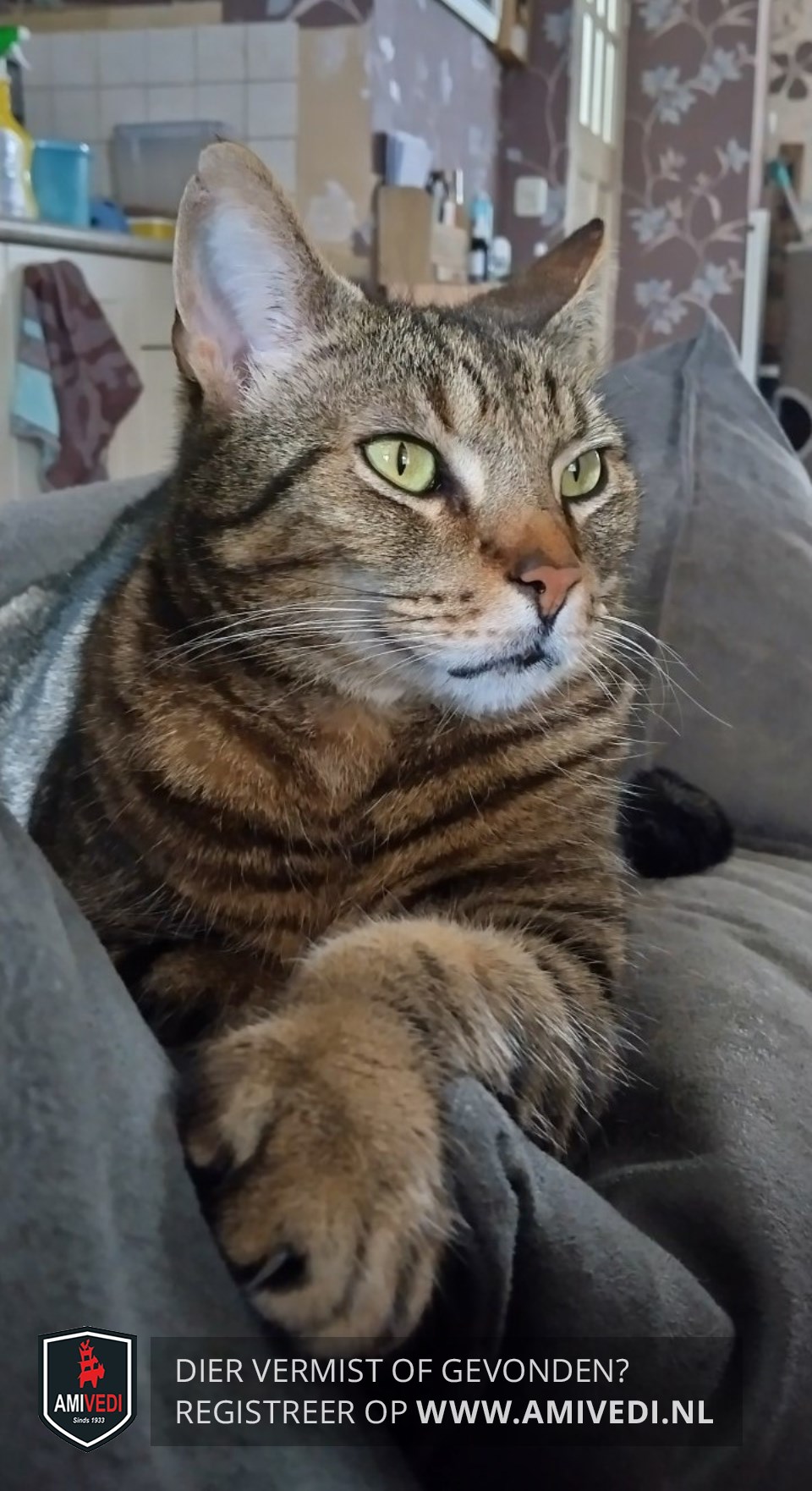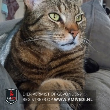 | Signalement | Cypers bruin/zwarte erg grote kater. Roodbruin neusje. Wit rond het bekje. Grotere zwarte plekken in de vacht. Angstig. |