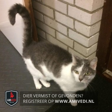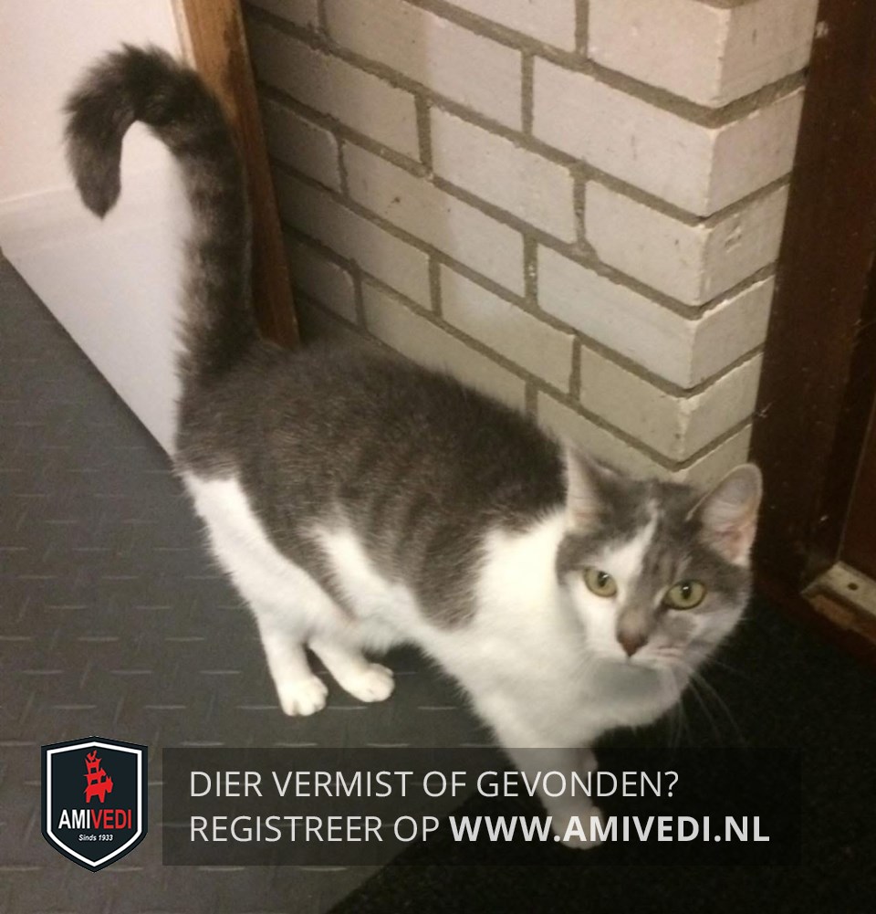 | Signalement | Cypers grijs - zwart met wit, cyperse oren, kopje links cypers grijs rechts rondom het oor cypers grijs de rechts is wit, onder de neus wit, vanaf de kin is het onderlijf inclusief poten wit, rug en staart cypers grijs. |