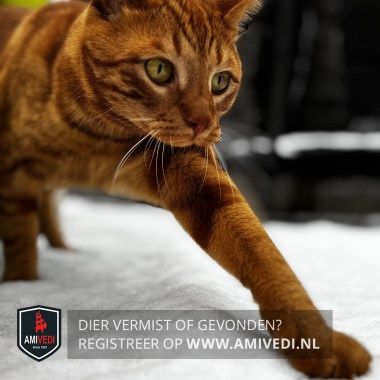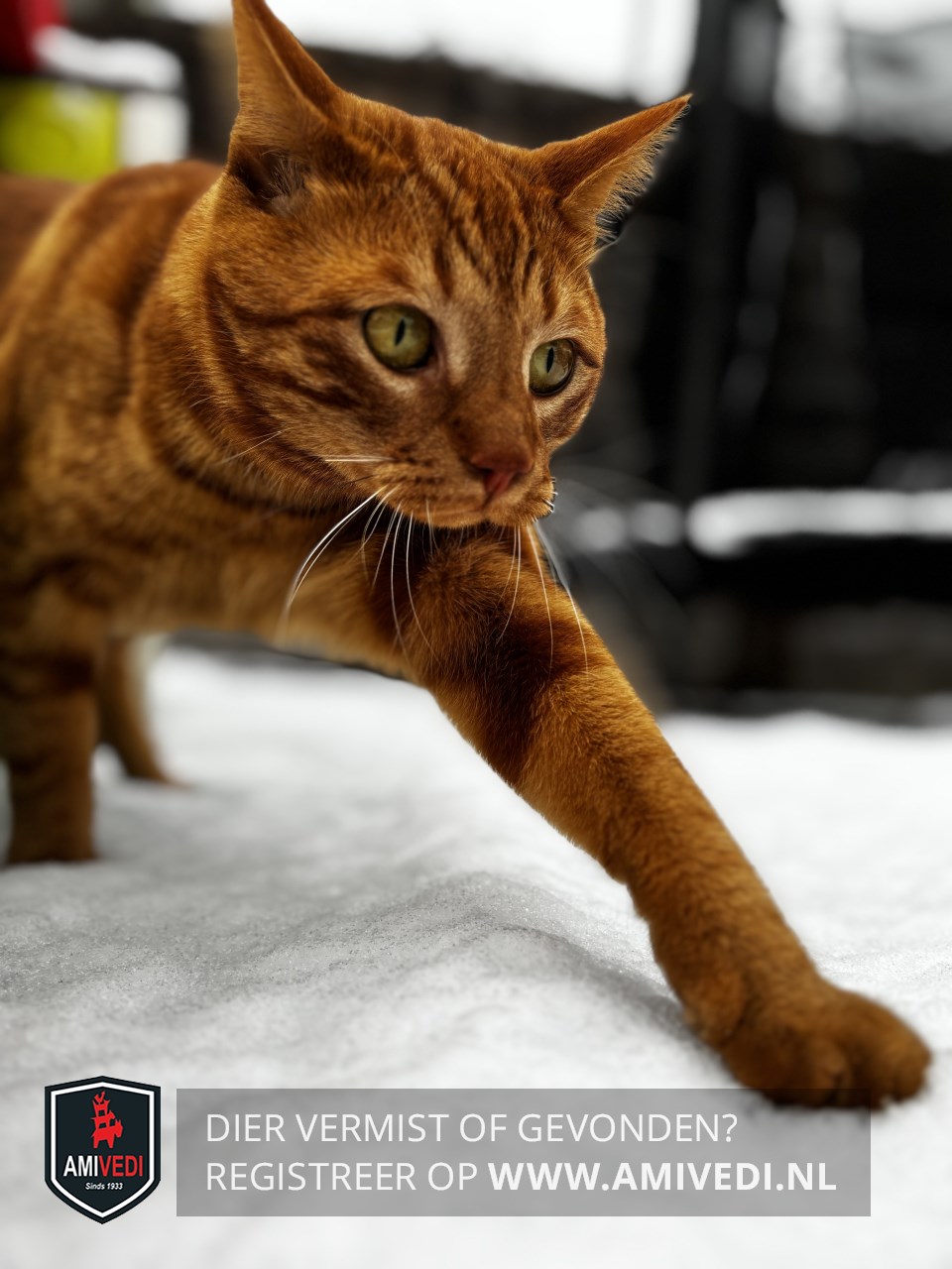 | Signalement | Volledig rode cyperse kater. Donkere ringen op beide voorpootjes. Groene ogen. |